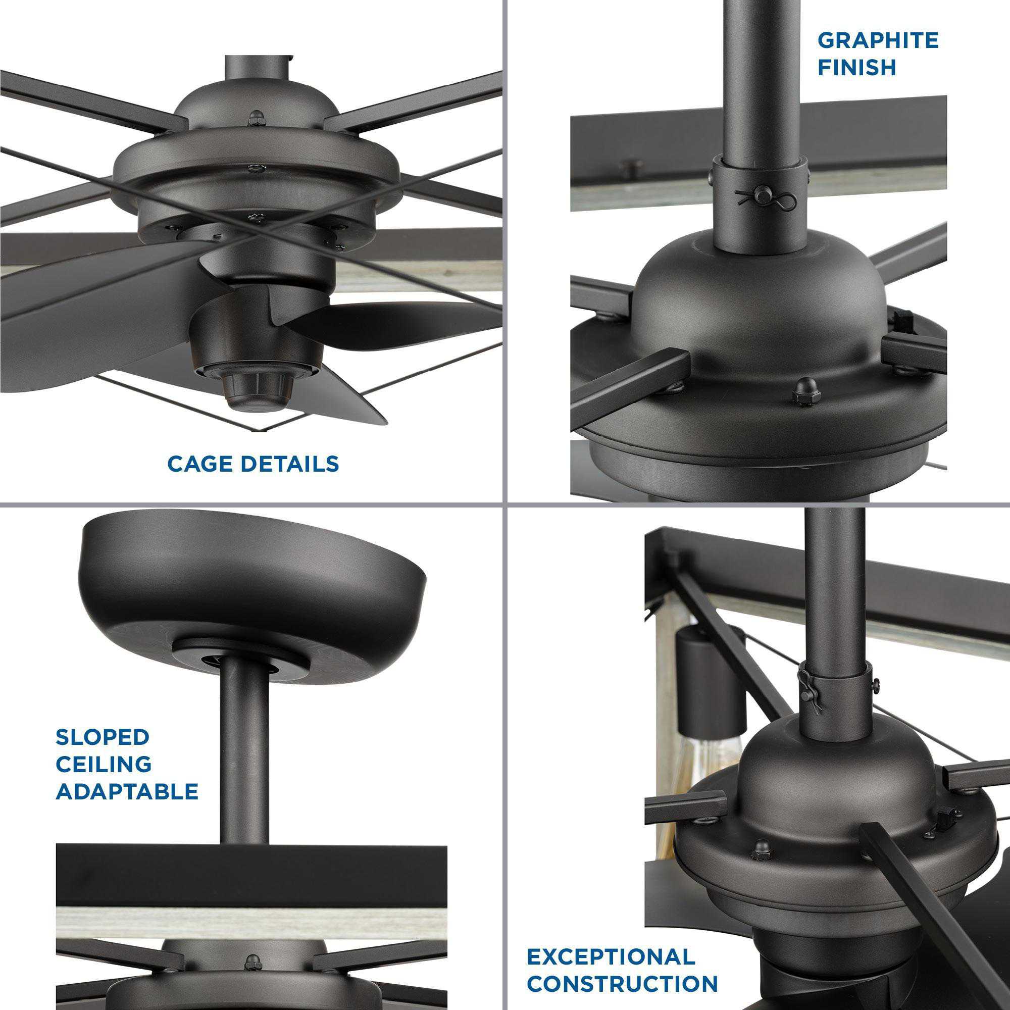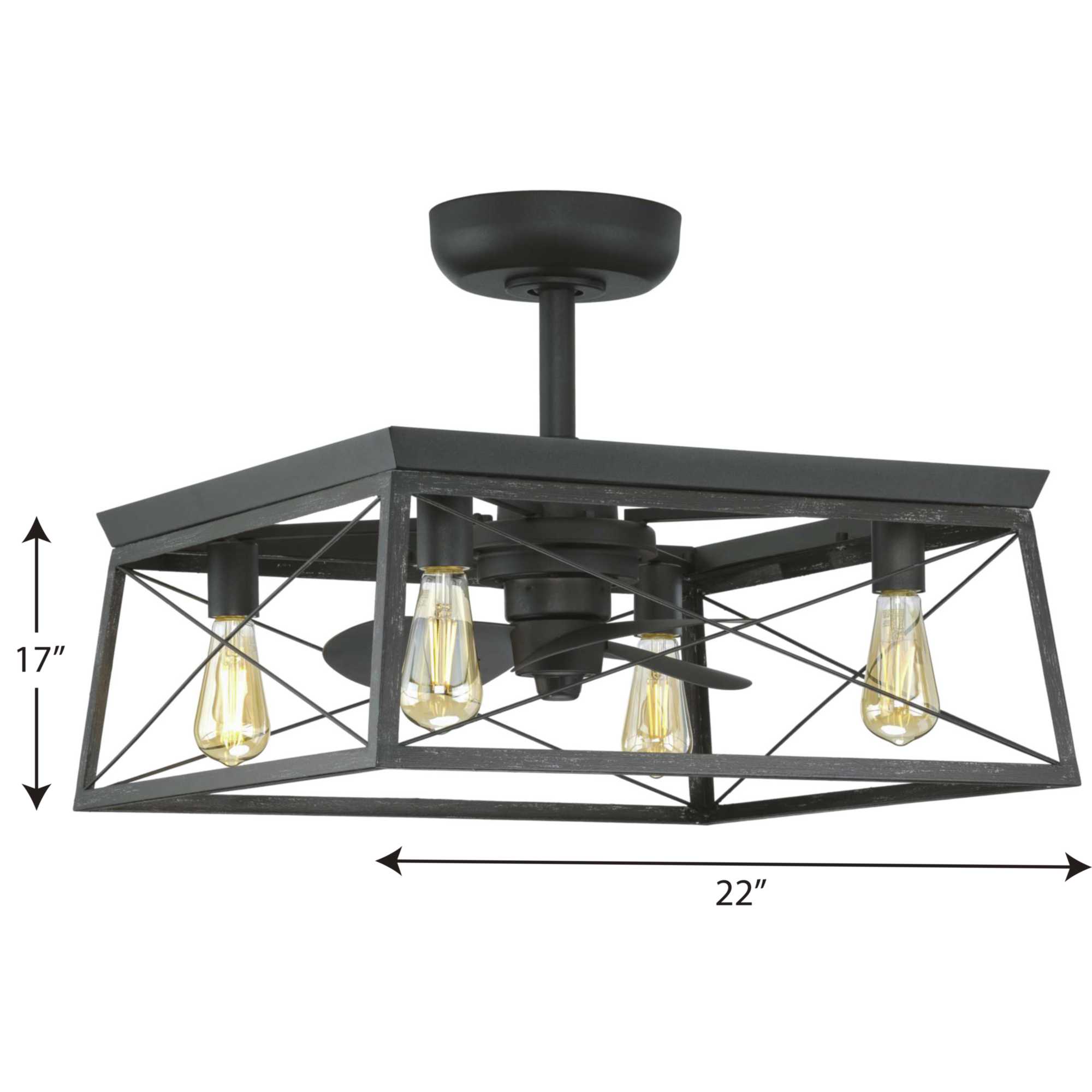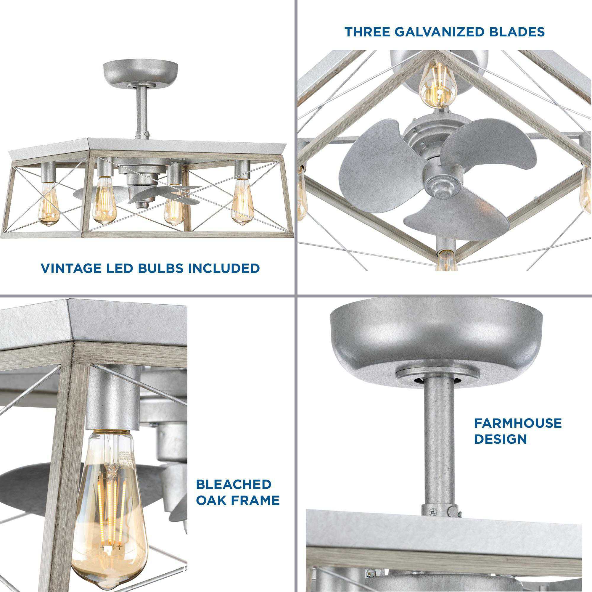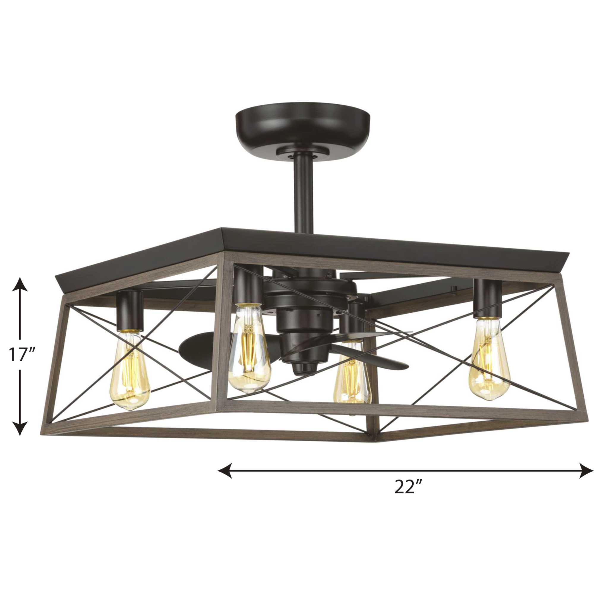 - The fan blades rotate within the rich oak open-frame design that boasts a classic cross-brace pattern