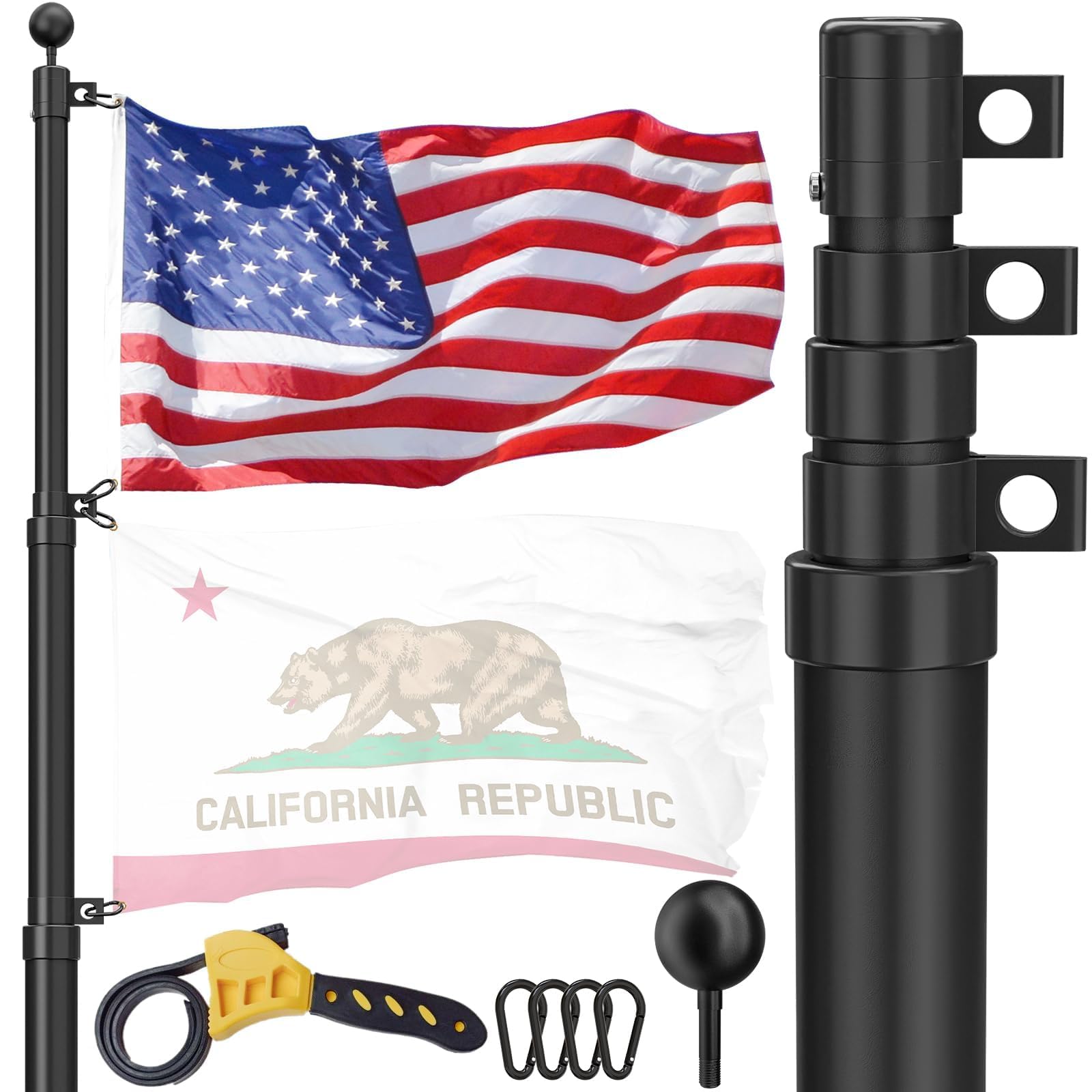 【What You Will Get】Telescoping flagpole, 1 special unlocking wrench, 1 PVC sleeve, 1 US flag, 1 black ball topper, 4 aluminum alloy flag clips, installation manual