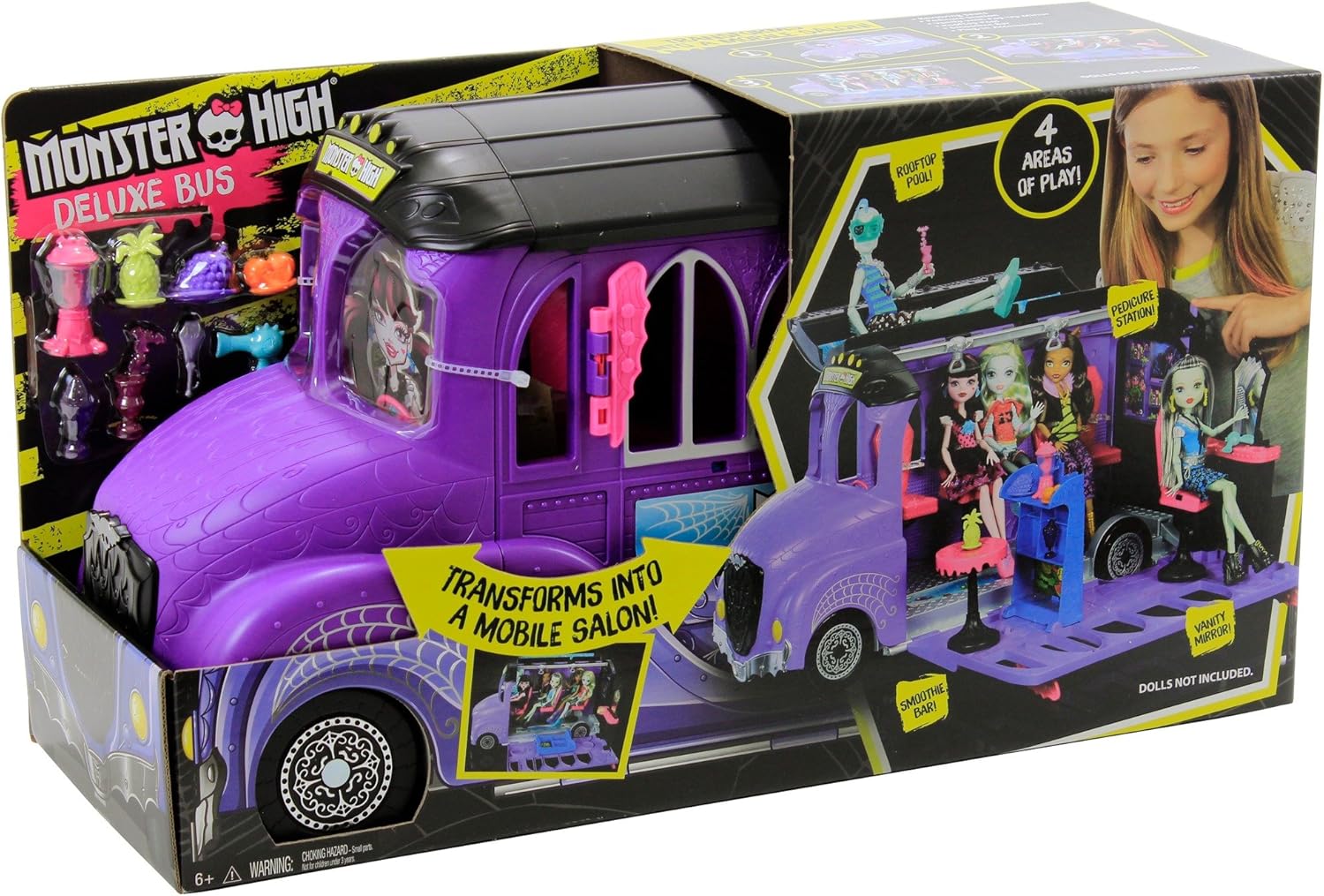 Hit the road with the Monster High bus. It's a fangtastic ride for school, a luxe transport for a field trip and a spooktacular spot to stop because this vehicle offers two-in-one fun -- it goes from a bus for six 12-inch dolls (sold separately) to a two-story spa for them all with easy transformation.
