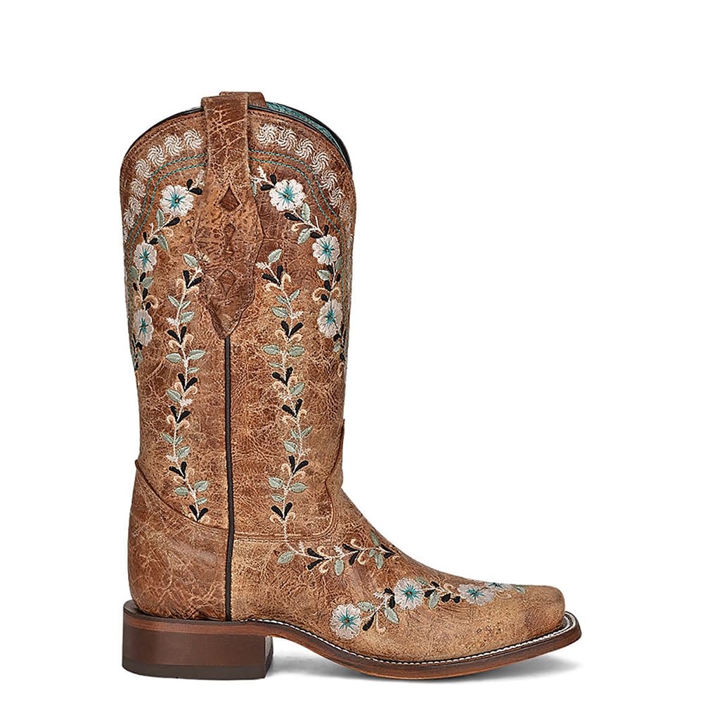 Corral Boots Women's Cognac Handcrafted Western Boots | Square Toe Tall Cowboy Boots with Glow in the Dark Floral Embroidery Design