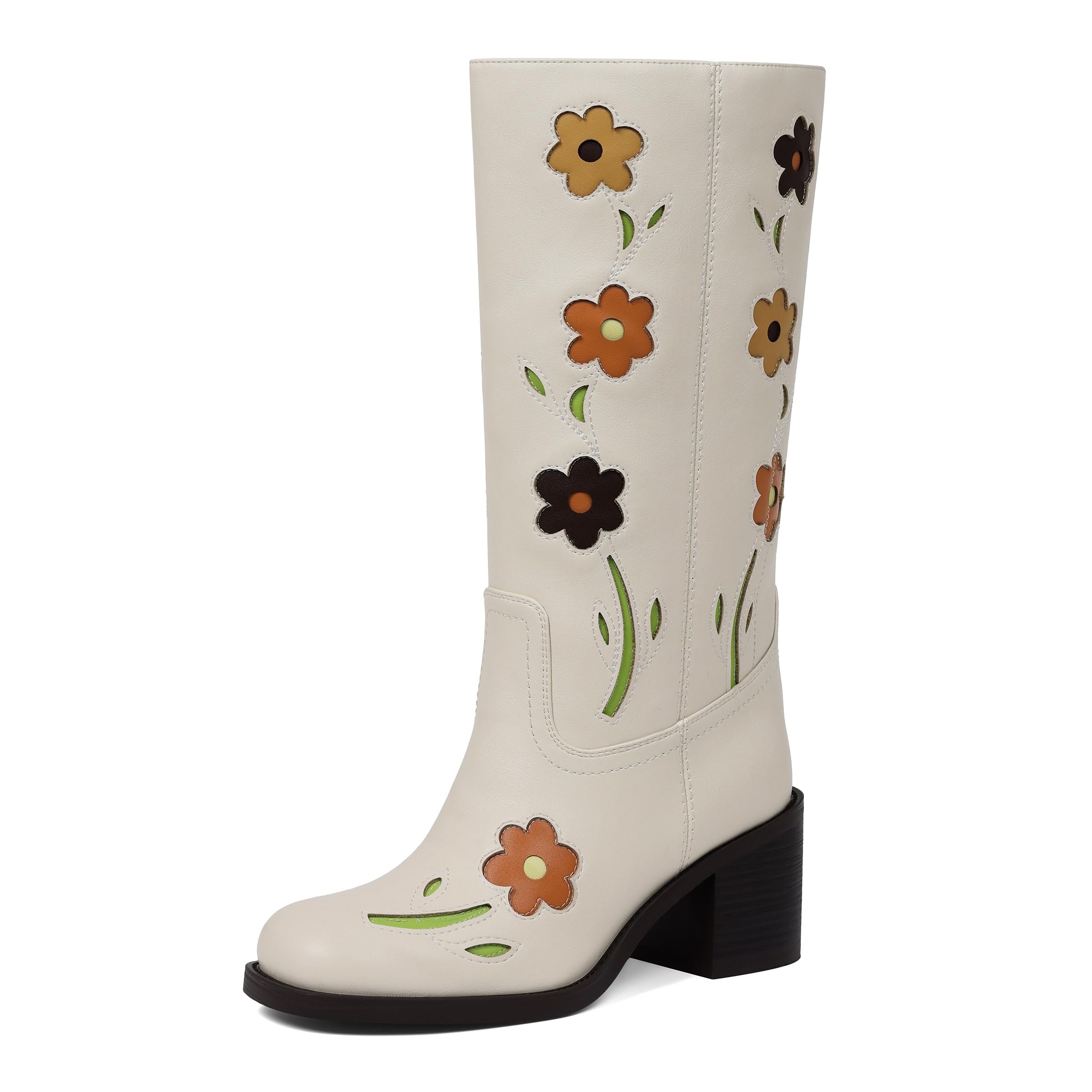 VIMISAOI Mid Calf Boots for Women Chunky Block Heel Women’s Tall Boots With Flowers Square Toe Comfortable Casual Pull on Boots Low Heel Fashion Boots