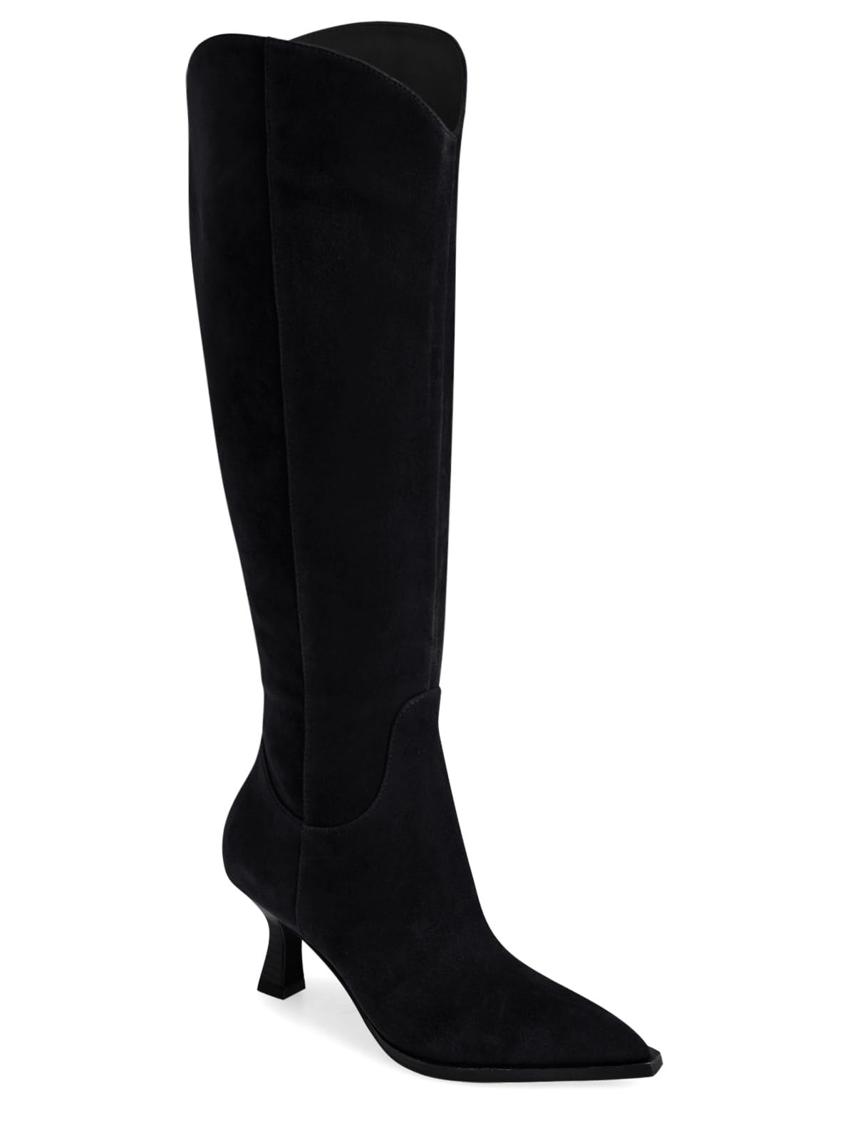 Coutgo Womens Wide Calf Knee High Boots Kitten Heel Pointed Toe Tall Boots Side Zipper Fall Winter Shoes, Black, Size 7.5