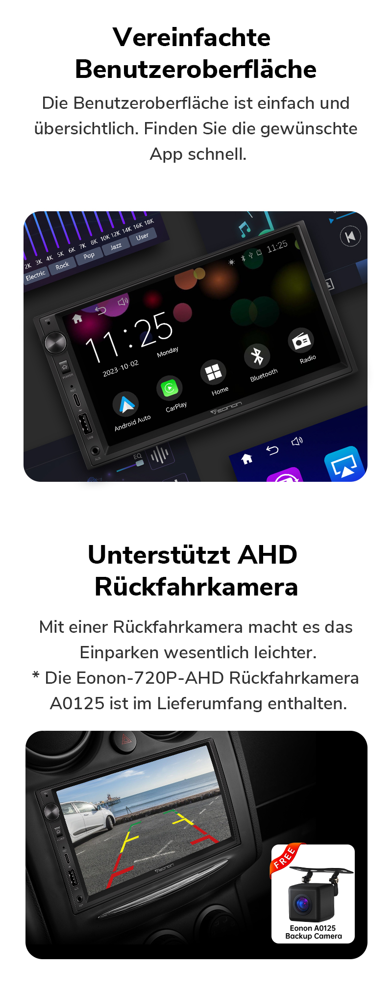 Das Eonon X3 ist ein preiswertes, aber hochwertiges Doppel-DIN Autoradio, entwickelt für Fahrer, die moderne Smartphone-Funktionen, guten Klang und ein klares Display möchten – ohne ein kompliziertes Android-System.