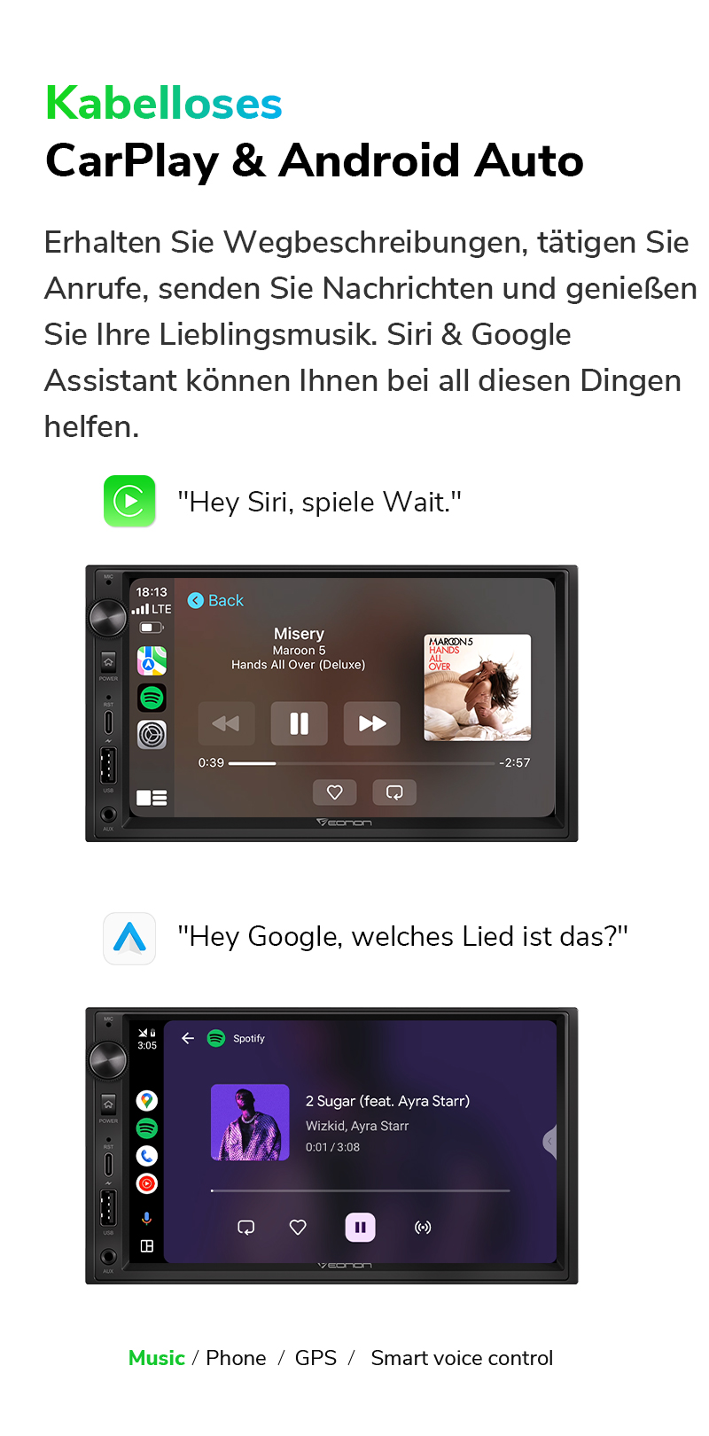 Unterstützt u. a. Google Maps, Apple Maps, Waze, Spotify, YouTube Music