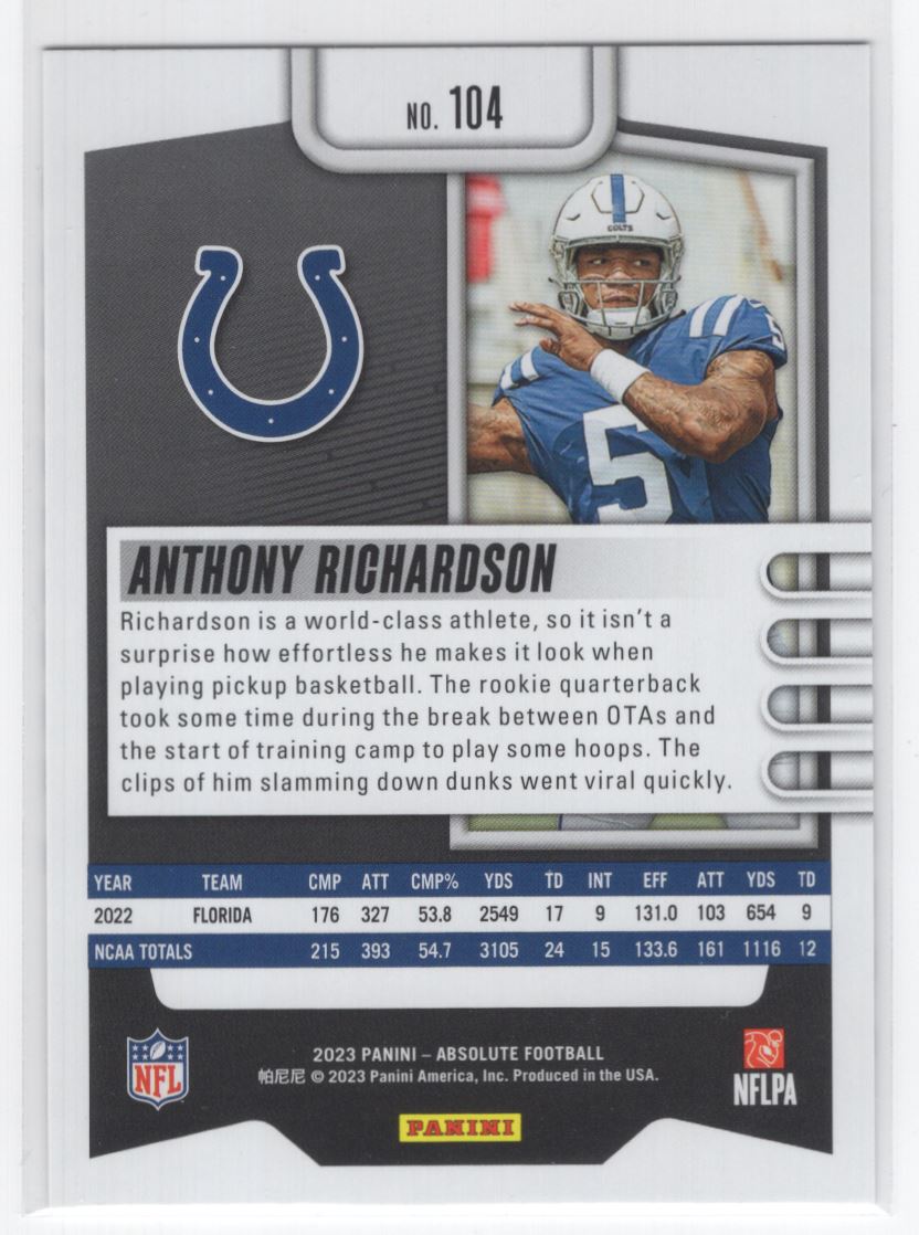 #104 2023 Absolute BASE ~ Anthony Richardson RC Indianapolis Colts
