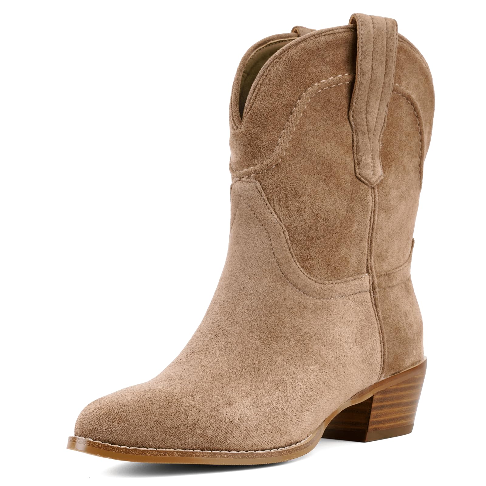 XUNHGAXE Women's Suede Ankle Western Cowboy Booties-Classic Vintage Slouchy Low-Heel Chunky Heel Slip-On Short Thick-Sole Fashion Mid-Calf Pointed Toe Short Boots-Apricot-7.5