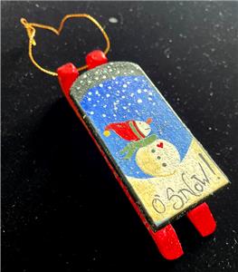 For sale is a House of Hatten Christmas ornament designed by Denise Calla in 2000; it is a sparkly sled with a snowman on it, about 4.5" x 1.5". Painted on it is "O'Snow!" It is in very good condition. Please ask any questions before purchasing.