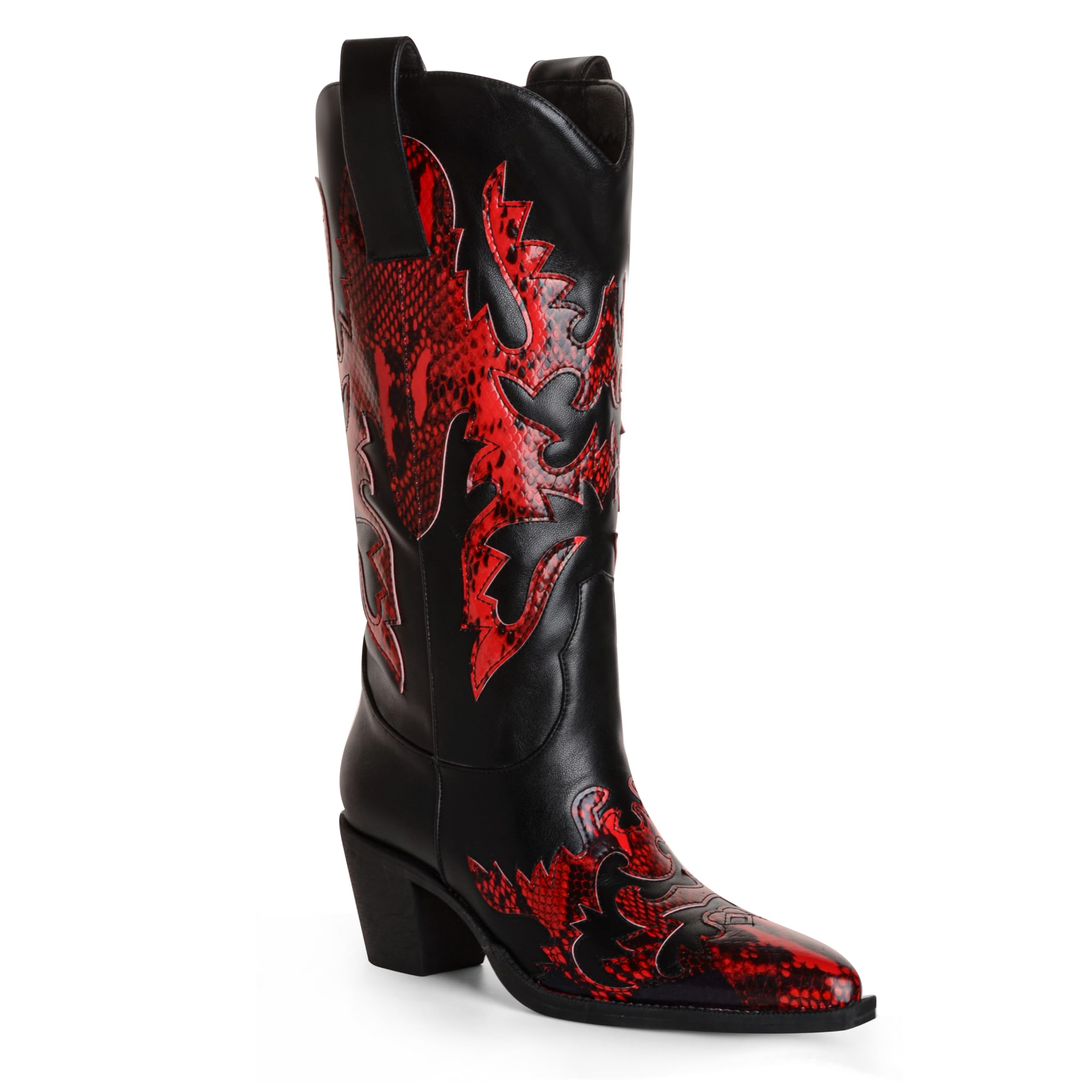 ANN CREEK Womens Cowboy Boots Pull on Cowgirl Boots for Women Mid Calf Two Tones Knee High Western Boots Dressy Pointed Toe Chunky Heel Patchwork Design Black Red US12