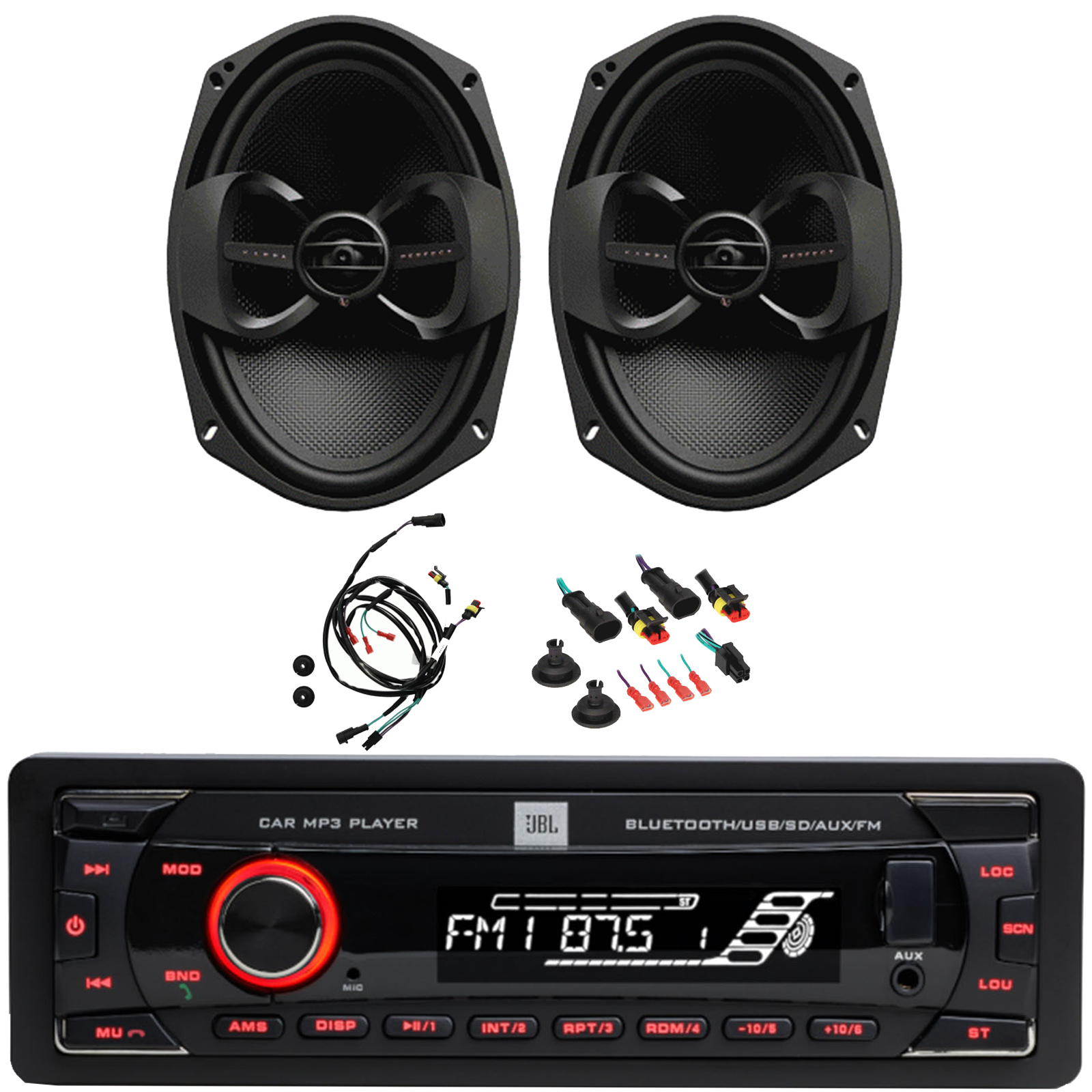 JBL Celebrity100 Single-DIN Bluetooth FM Radio USB/AUX SD/MP3 High Power Stereo Receiver, 2x 6x9” 300 Watt Max Power Water-Resistant Speakers, (2014-2022 Harley-Davidson Street Glide, Road Glide)