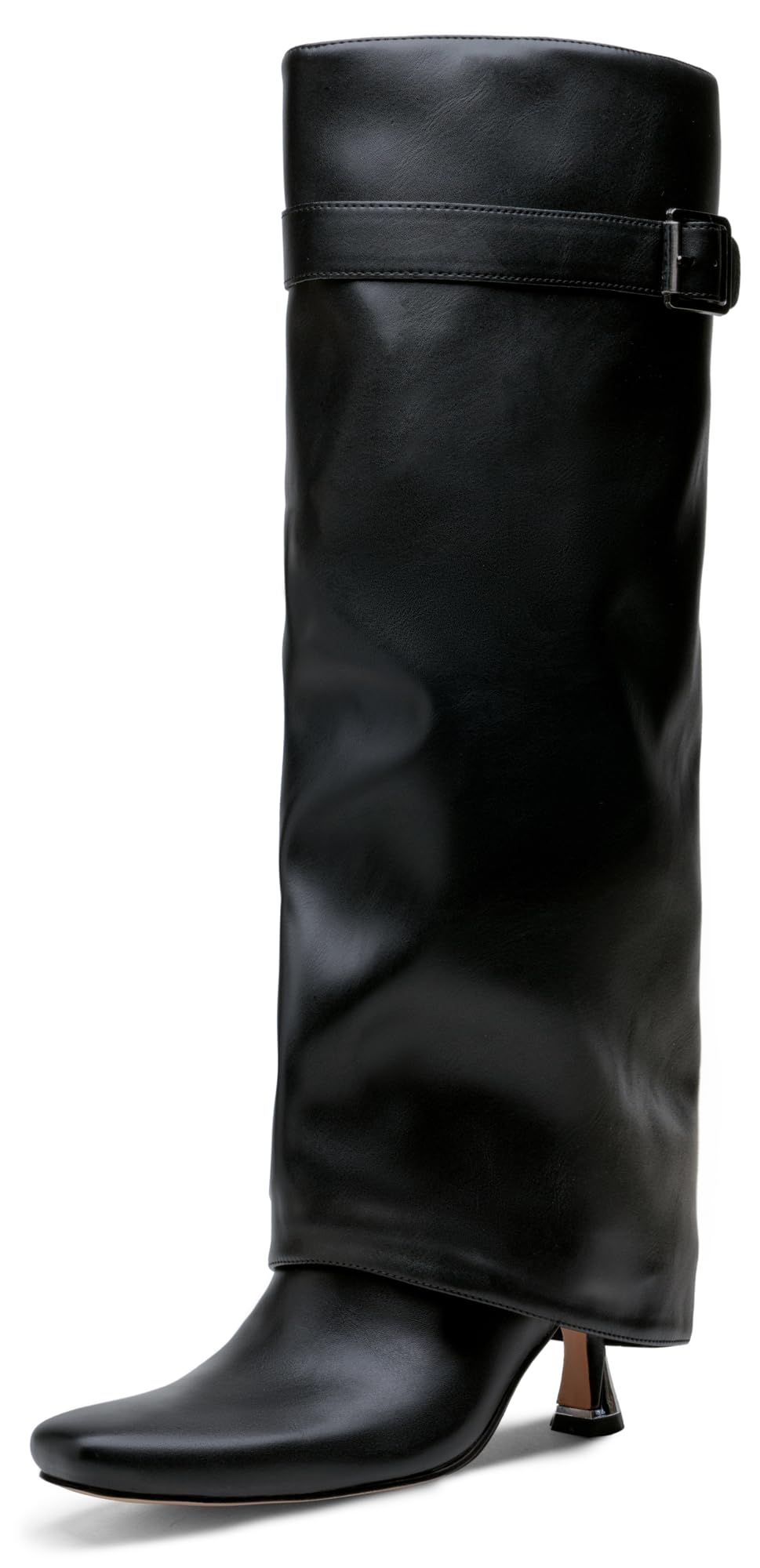 Vepose Knee High Tall Long Boots for Women, Square Toe Fold Over Fashion Cute Kitten Heel Faux Leather 9527 Boots, Black, Size 11 US with Buckle Inside Zipper, Botas altas Mujer (CJY9527 Black 11)