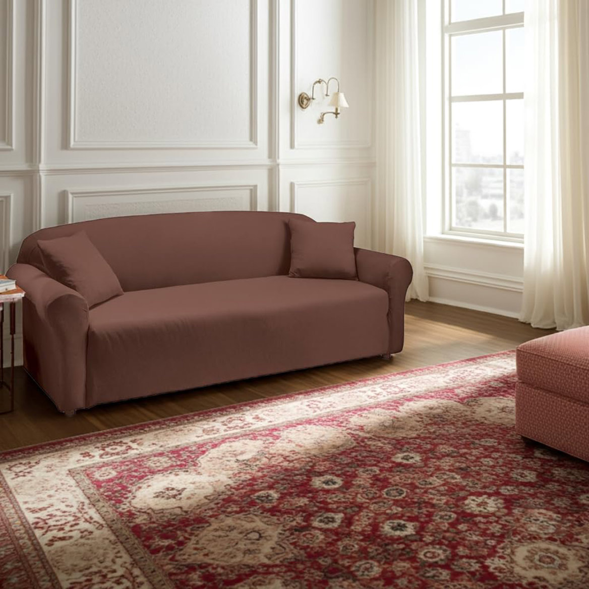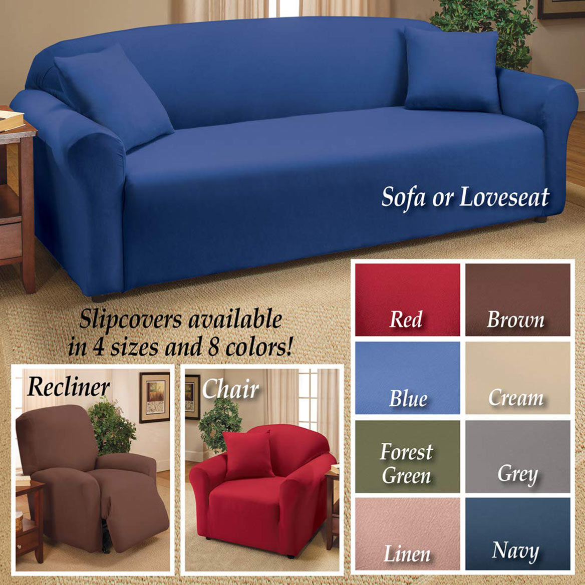 Give your furniture an easy update with these attractive knit jersey slipcovers that stretch for a perfect fit. The covers fit recliners, chairs, loveseats and sofas and help protect your furniture from spills and pet hair. Machine washable. Polyester and spandex. Colors available in Red, Brown, Linen, Forest Green, Turquoise, Cream, Navy, Grey, Blue or Purple. Sizes available to fit a Chair (fits 32" to 40"W), Recliner (fits up to 88" around), Loveseat (fits 40" to 73"W) or a Sofa (fits 74" to 96"W).