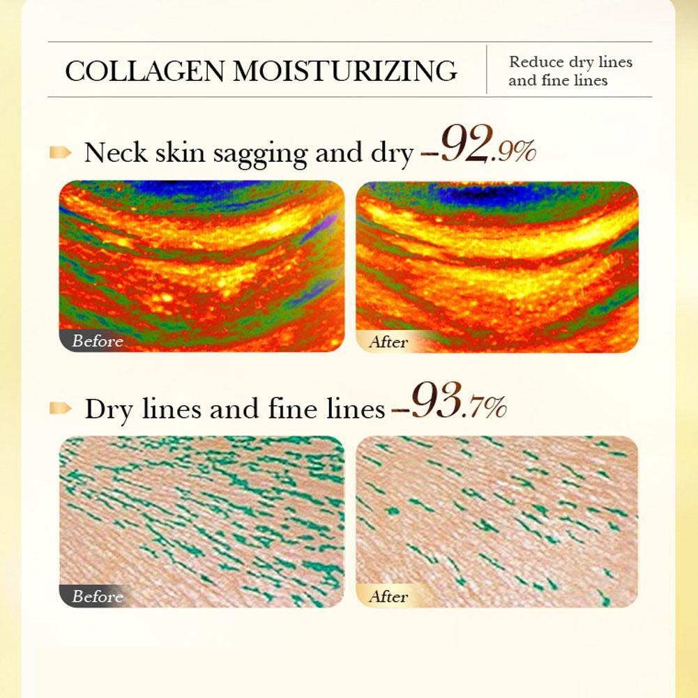 1. Targeted Fine Line Reduction: Experience remarkable results with our 24-K Golden Collagen Neck Mask, specifically formulated to significantly reduce the appearance of fine lines on your neck. Achieve an impressive reduction of up to -98.2% in fine lines, revealing smoother, more youthful-looking skin with consistent use.