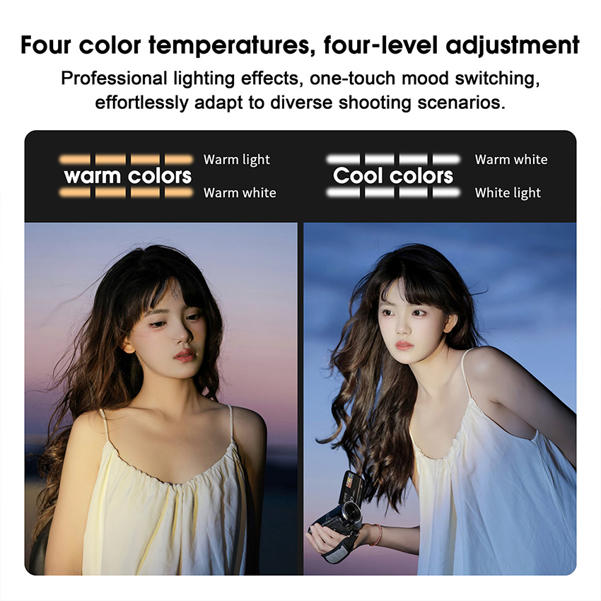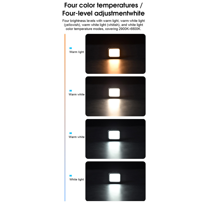 l Four adjustable color temperatures: Supports warm light, warm white light (yellowish), warm white light (whitish), and white light modes, covering the 2900K–6800K color temperature range for flexible adaptation to diverse shooting environments and subject requirements