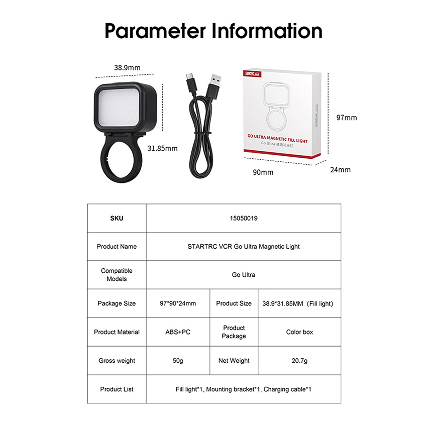 l 1x Fill Light + 1x Mounting Bracket + 1x Charging Cable