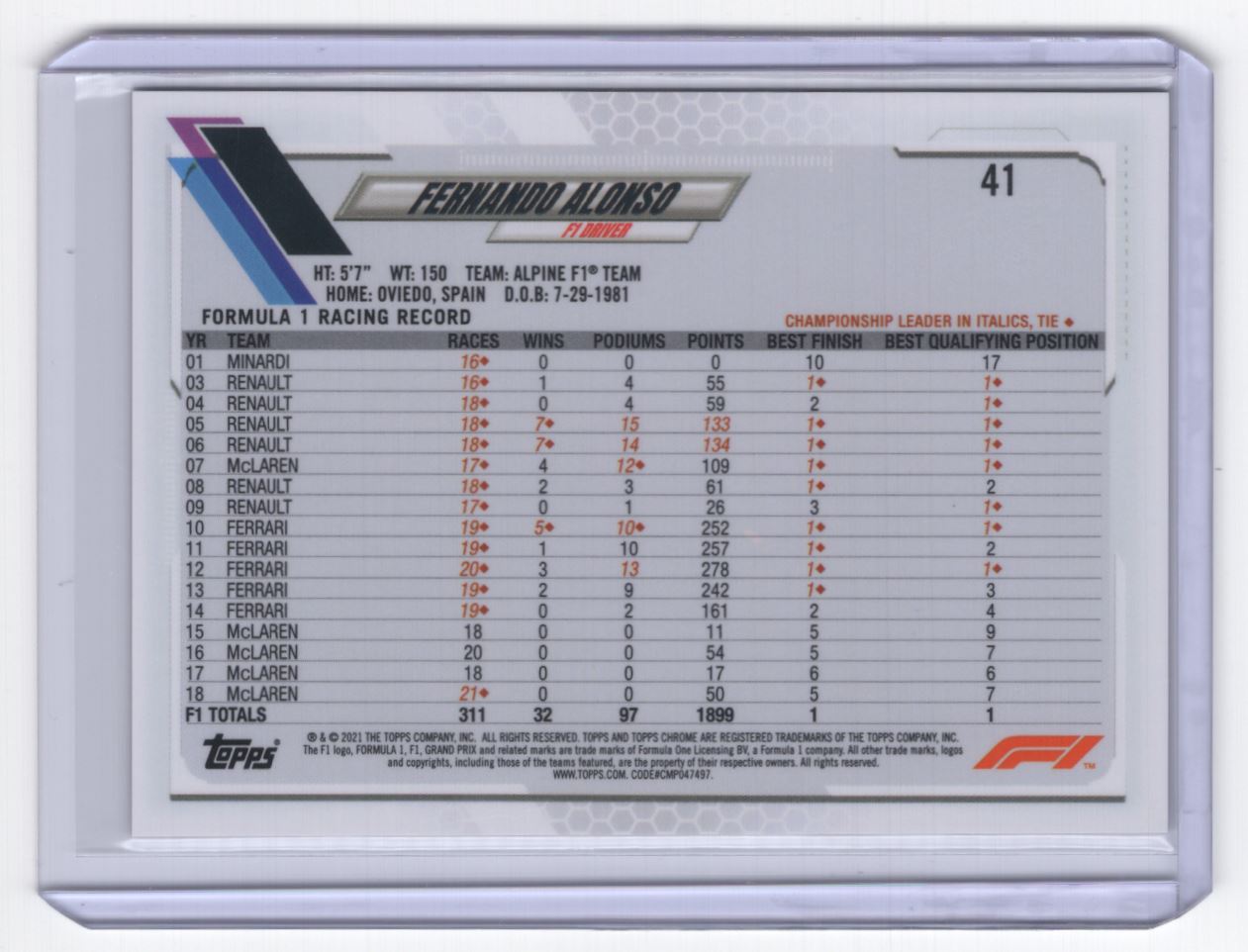 2021 Topps Chrome Formula 1 Fernando Alonso Alpine F1 Team #41