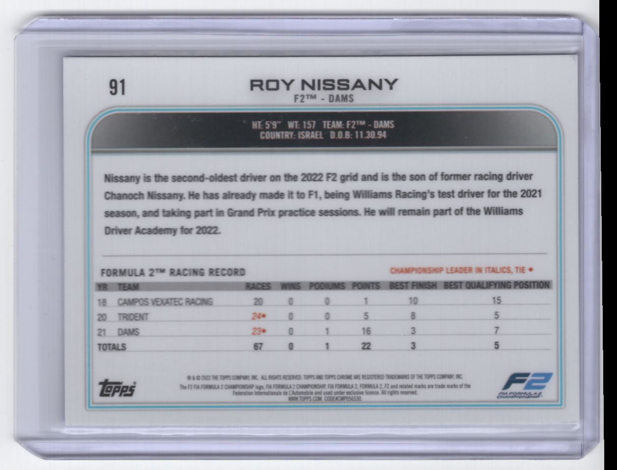 2022 Topps Chrome Formula 1 Sapphire / Roy Nissany Dams #91