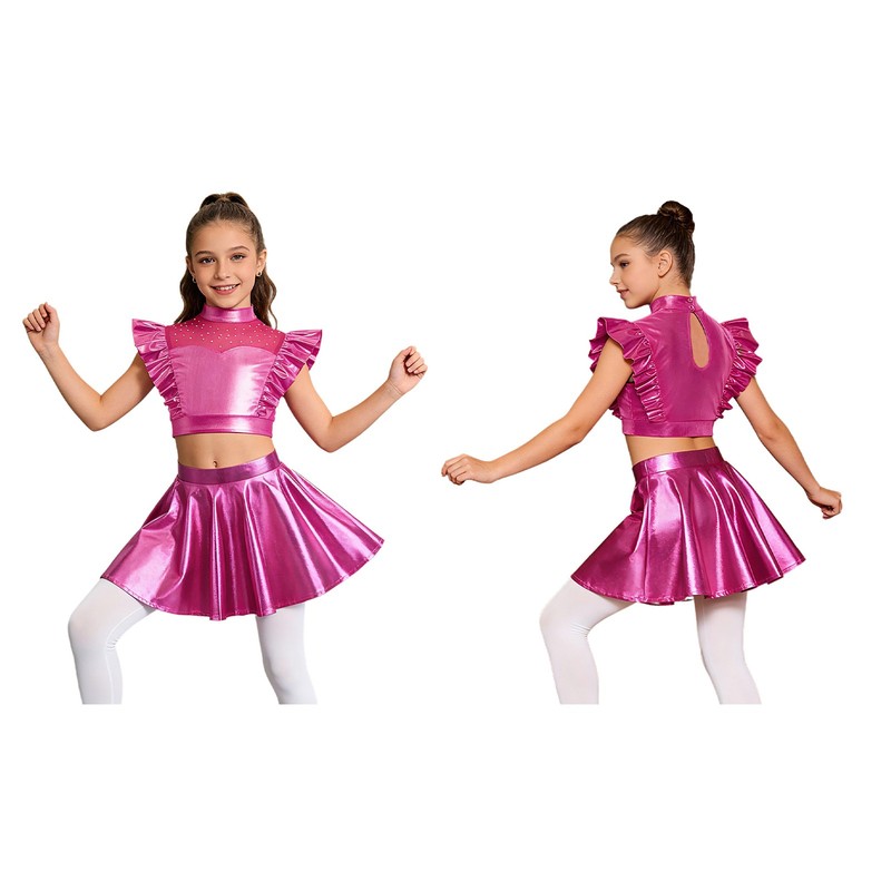 The elastic waistband on the skirt ensures a snug fit, and the shiny flared skirt with ruffles gives a playful look, in line with the latest fashion styles.