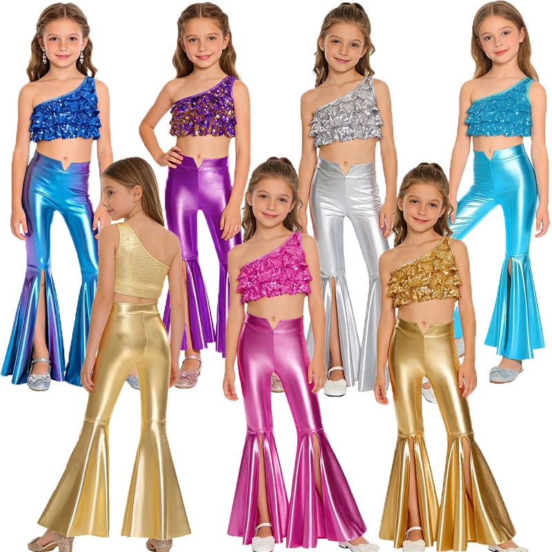 The split bell-bottom metallic pants are both stylish and practical, suitable for dance performances, stage shows, parties, or other special occasions.