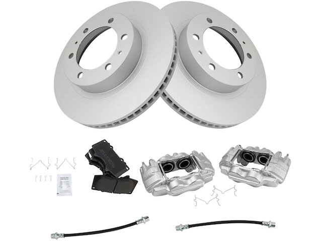 - Package Contents: (1) Front Semi-Metallic Brake Pad Set; (2) Front Brake Calipers; (2) Front Premium G-Coated Brake Rotors; (2) Front Replacement Brake Hoses