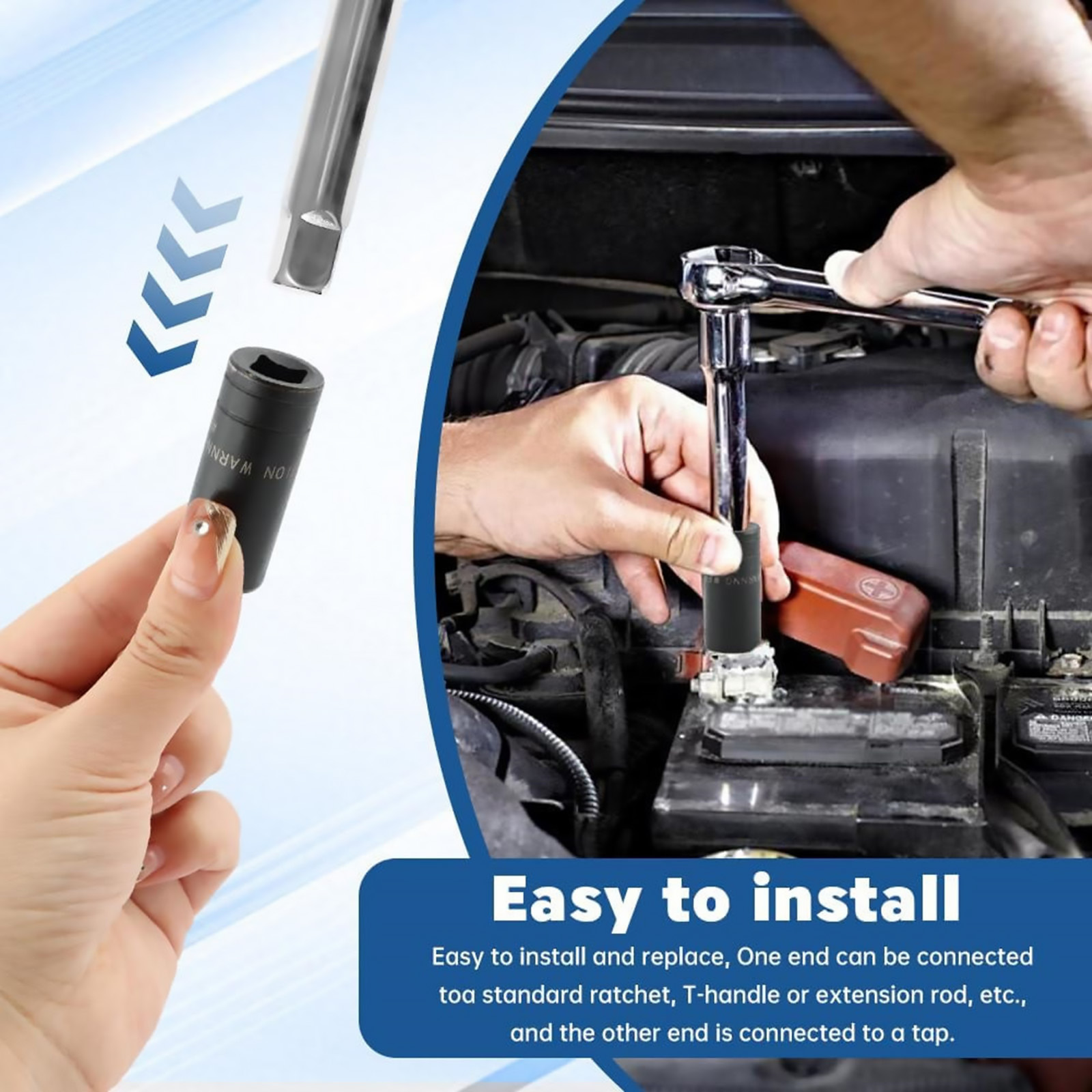 The tap holder socket is made of high-quality carbon steel and has a black coating on the surface, which can ensure the durability of tap sockets. The square end design ensures a tight fit with the tap, prevents slippage and protects the tap thread from damage.