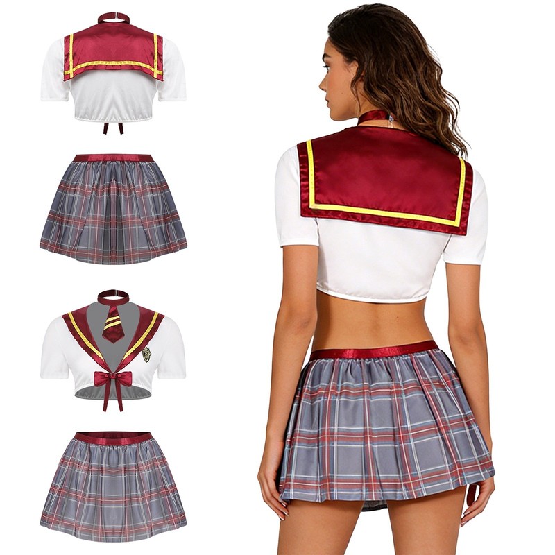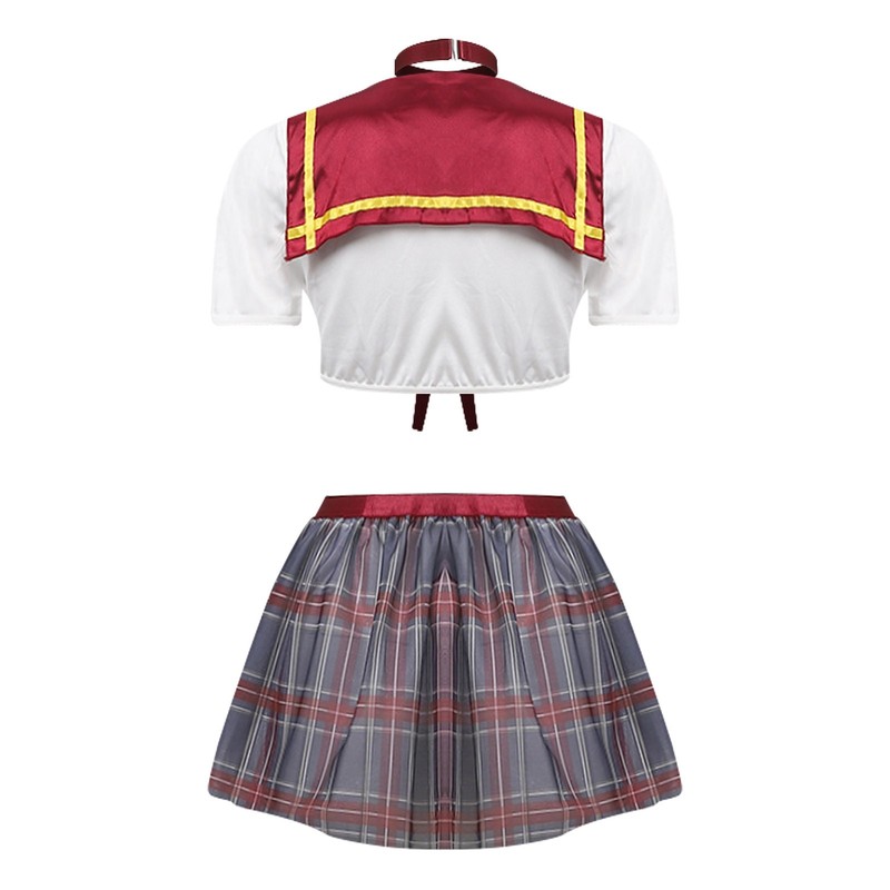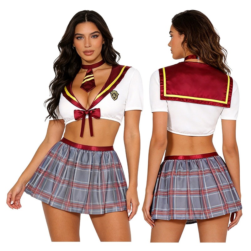 Set Include: 1Pc Crop Top, 1Pc Necktie, 1Pc Mini Skirt, 1Pc Thong, 1 Pair of Stockings