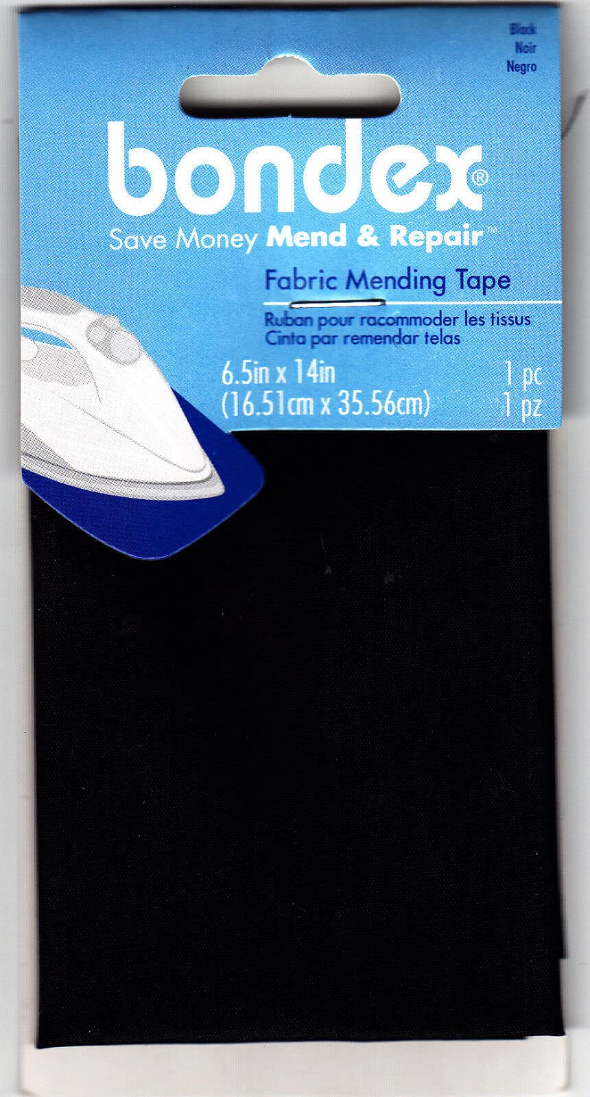 BONDEX Black Fabric Iron On Mending Tape. Size: 6 1/2" x 14".Application Instructions: Be sure garment fiber content can withstand heat setting required for application. (1) Wash garment before applying patch. (2) Preheat iron on dry cotton setting. (3) Cut patch to desired size and shape. (4) Preheat garment area, position patch (shiny side down) and press with iron for 30 seconds. (5) Allow patch to cool and check bond. Repeat Step 4 if necessary. (Instructions are also on back of packet.): FREE