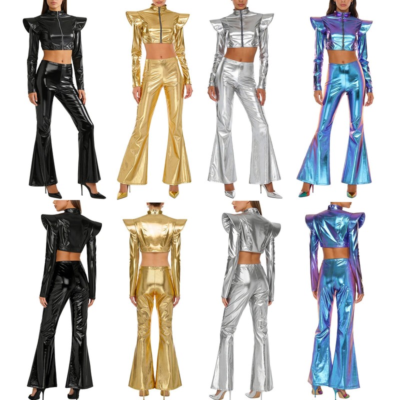 The metallic shiny finish gives the outfit a trendy and eye-catching look, perfect for making a statement in any event.