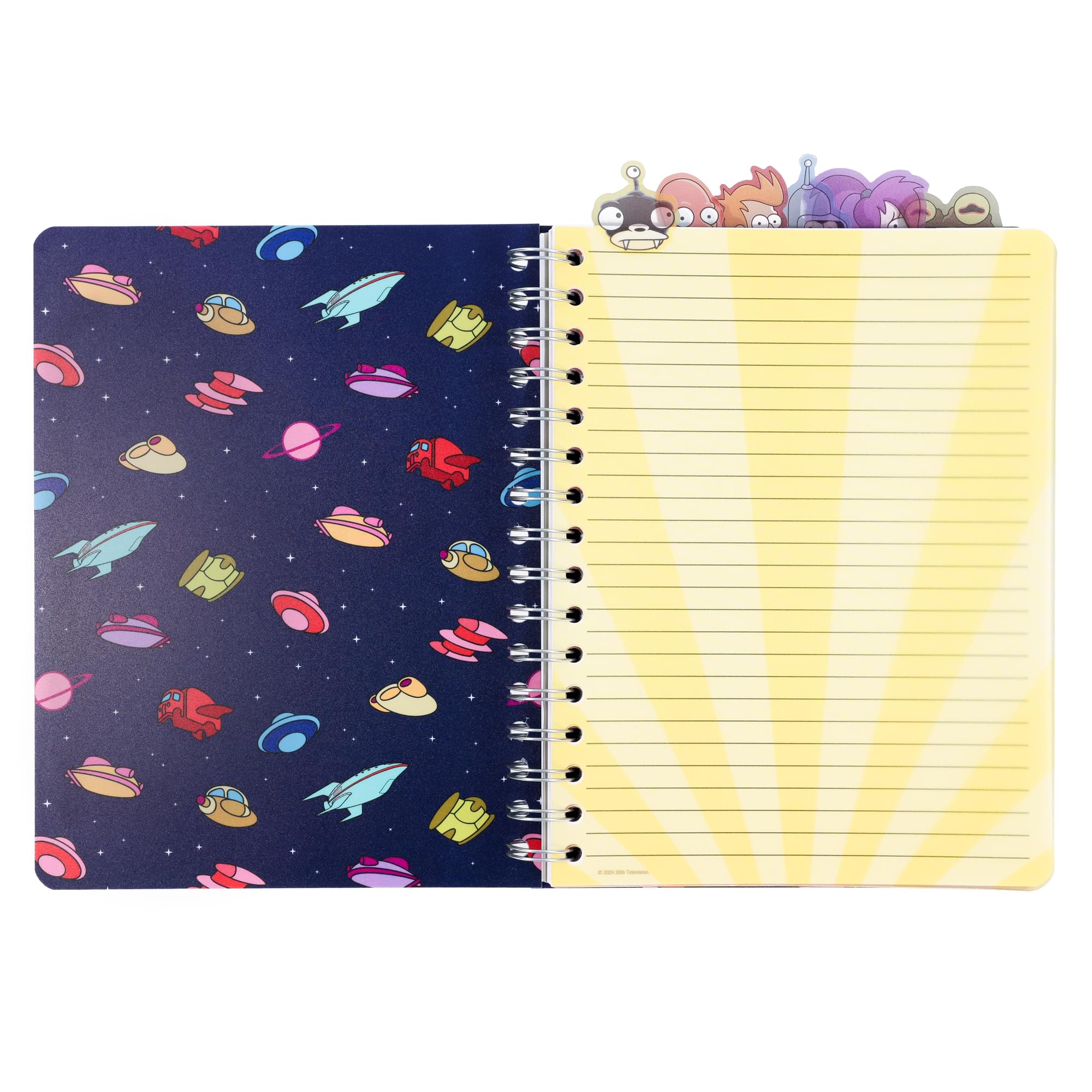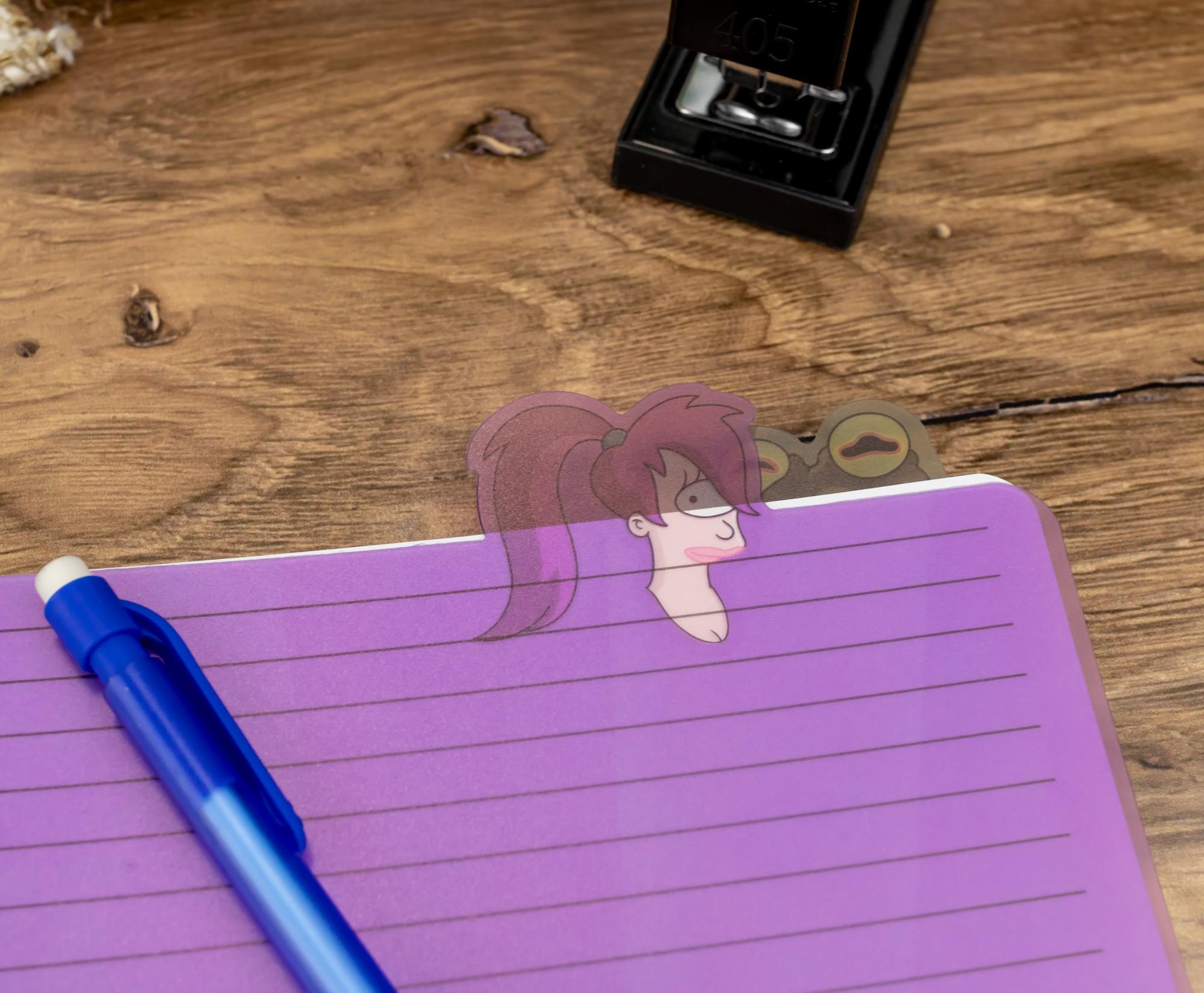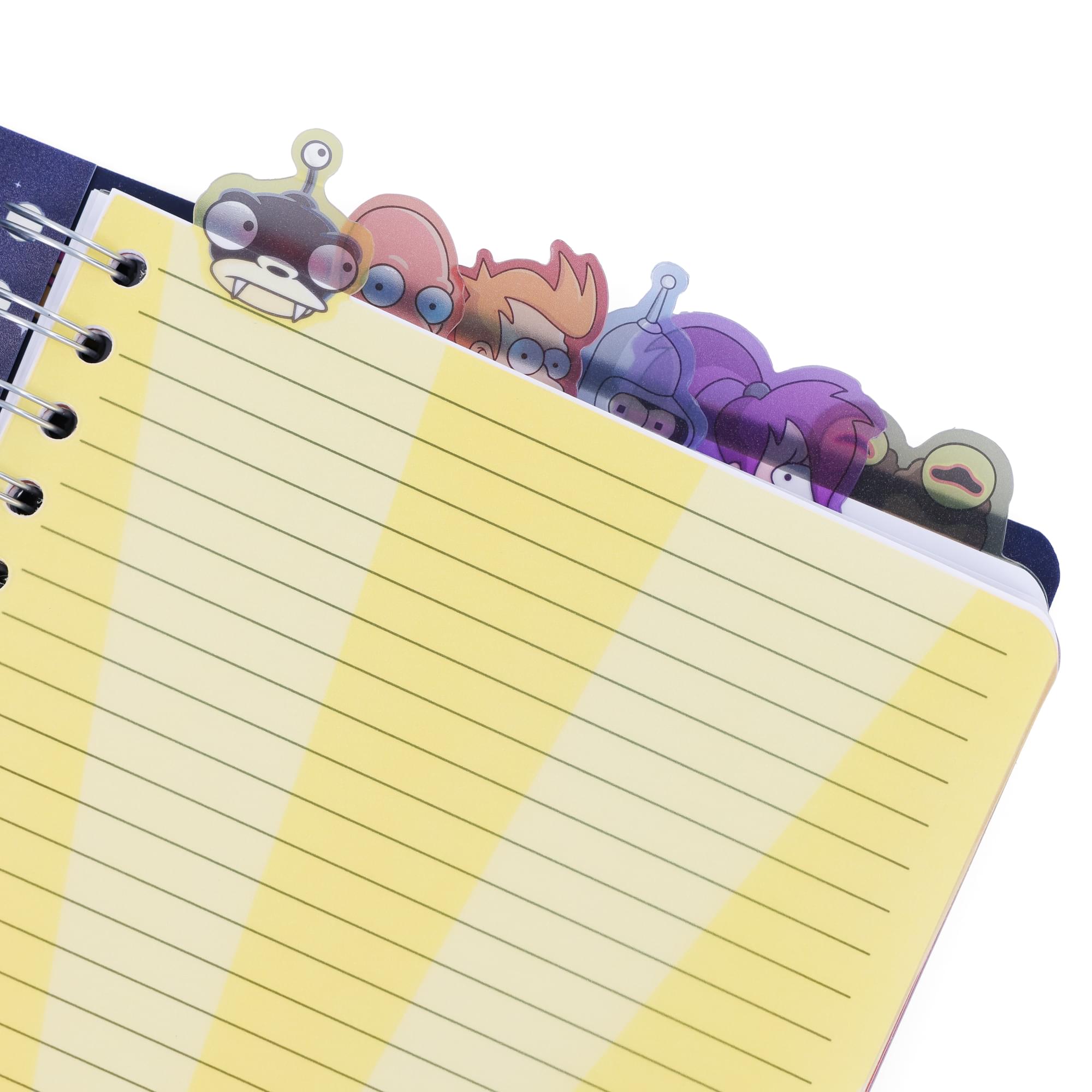 Inside are six organizer tabs, each featuring a beloved character from the hit animated comedy. Let Nibbler, Zoidberg, Fry, Bender, Leela, and the ever-mesmerizing Hypnotoad help keep your notes in order.