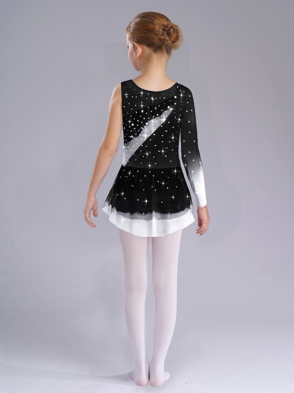 The shiny rhinestones on the dress sparkle under the light, creating a glamorous and eye-catching effect, perfect for performances.