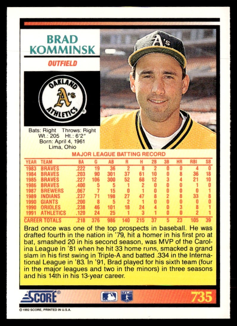 1992 Score Brad Komminsk Oakland Athletics #735