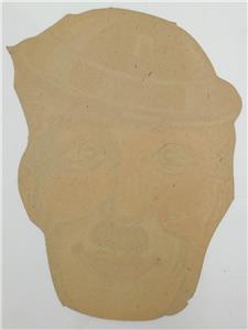 This pre war Japanese vintage paper mask is one of a series. This mask is Charlie Chaplin. The flat lithographed paper has eyes that are slightly pre-cut to remove them so you can see where you are going. There are also holes for elastic or string (which is not supplied). The eyes are still attached on this mask.