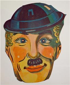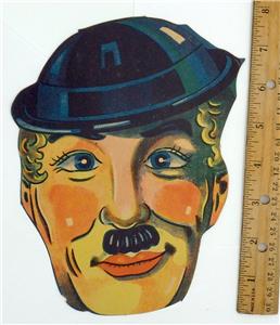 The paper Chaplin face is 7.75 inches (19.5 cm) tall. These masks are made of a fairly thin paper. Condition is very good to excellent. Colors are bright and unfaded.