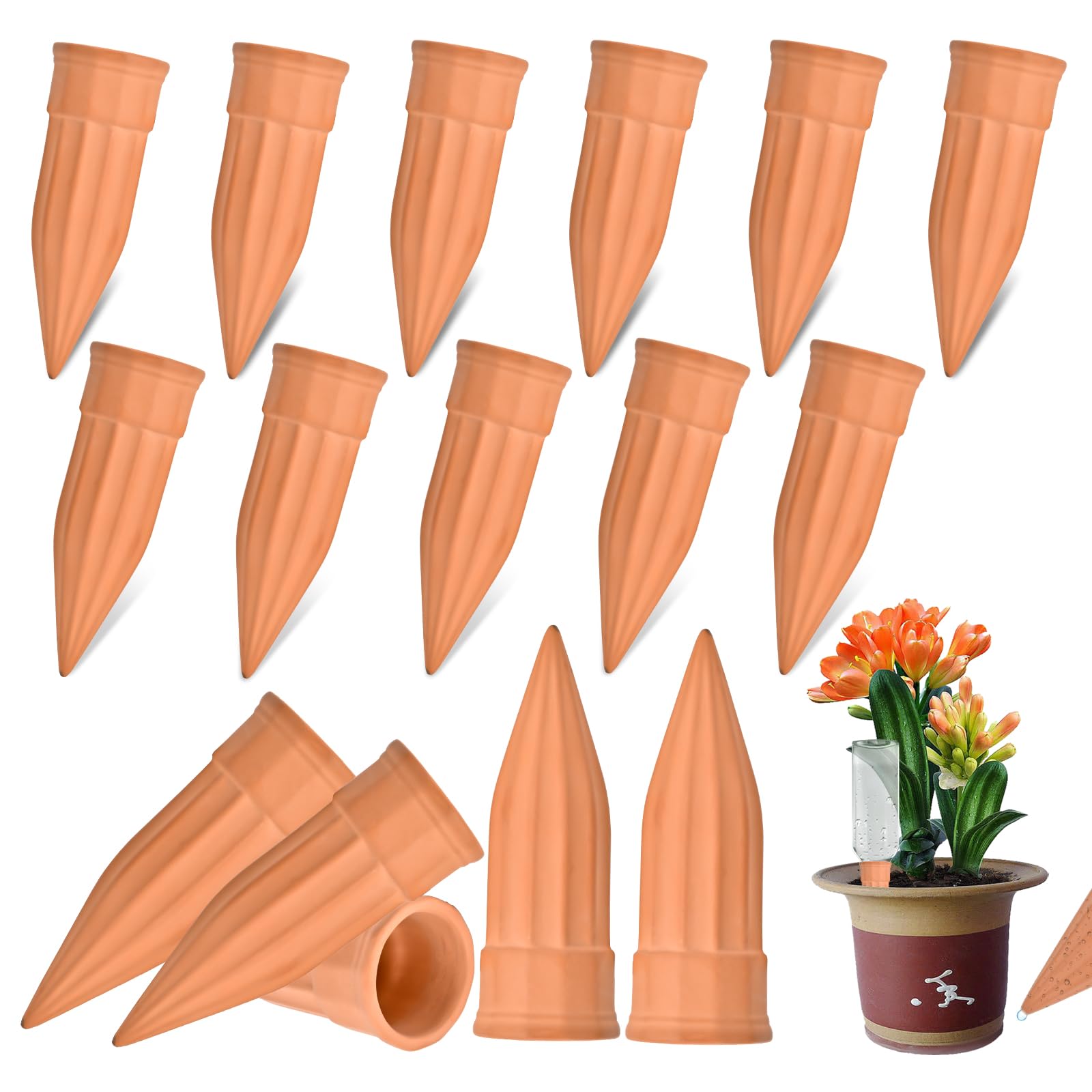 【Package Details and Satisfaction Guarantee】 This set includes 16 terracotta self-watering spikes, each measuring approximately 5.3" x 1.9", suitable for various pot sizes. Customer satisfaction is our top priority—if you have any issues, feel free to reach out to us. We're here to make sure you're completely satisfied!