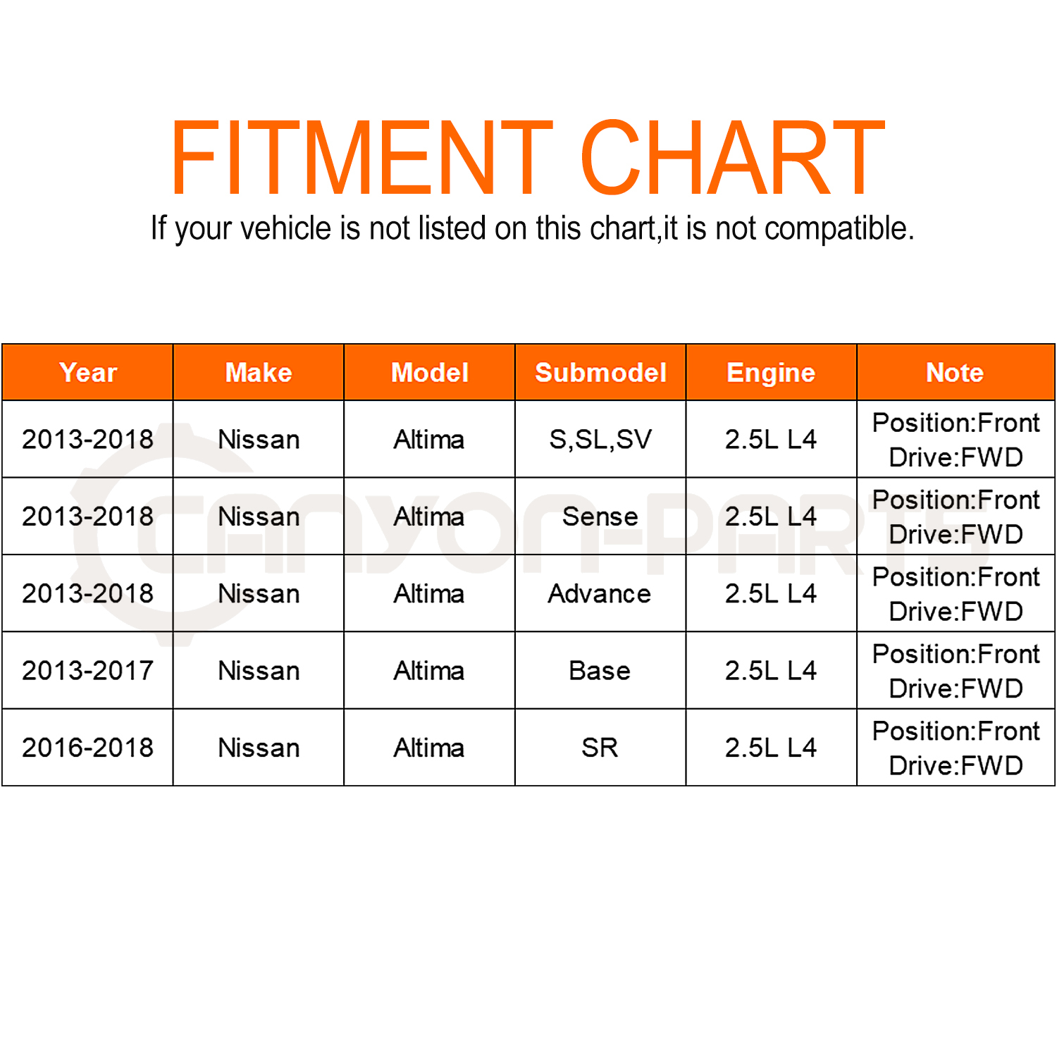 | 2013-2018 | Nissan | Altima | Front | L4 2.5L;w/AT CVT |