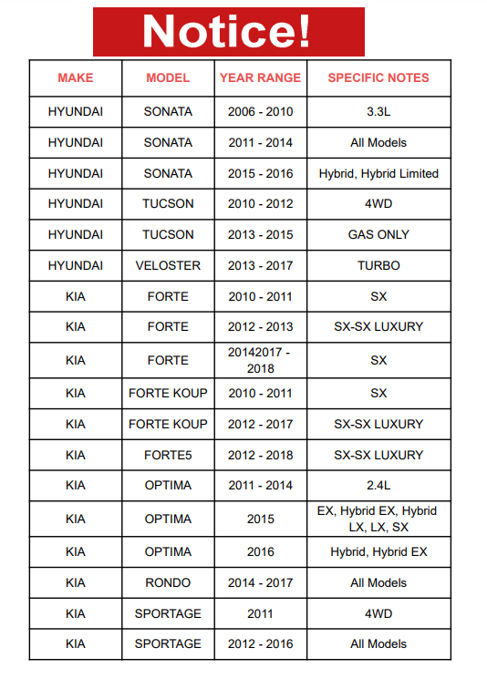 | HYUNDAI | TUCSON | 2013 - 2015 | GAS ONLY |