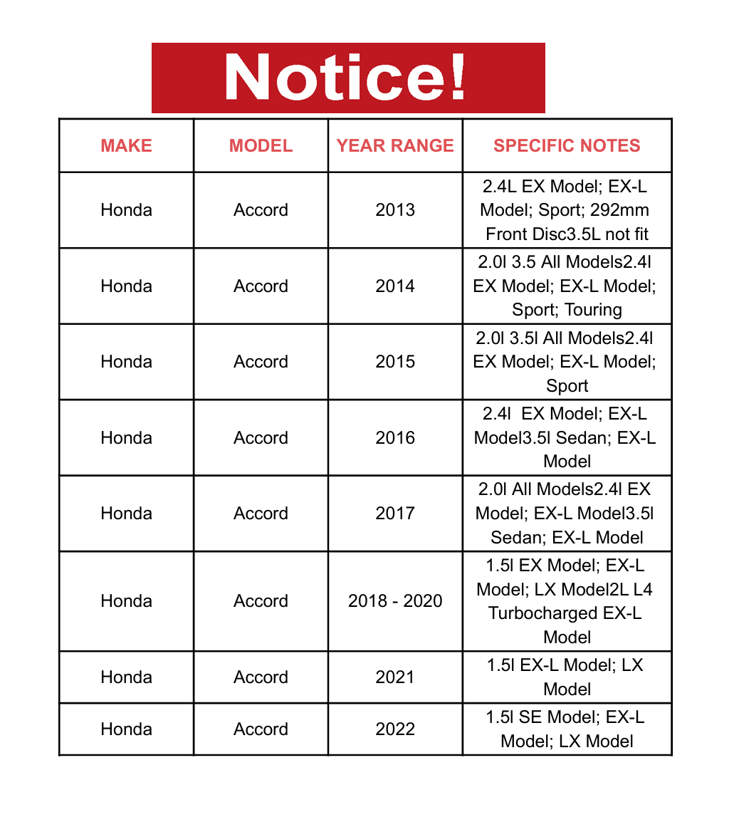 | Honda | Accord | 2013 | 2.4L EX Model; EX-L Model; Sport; 292mm Front Disc 3.5L not fit |