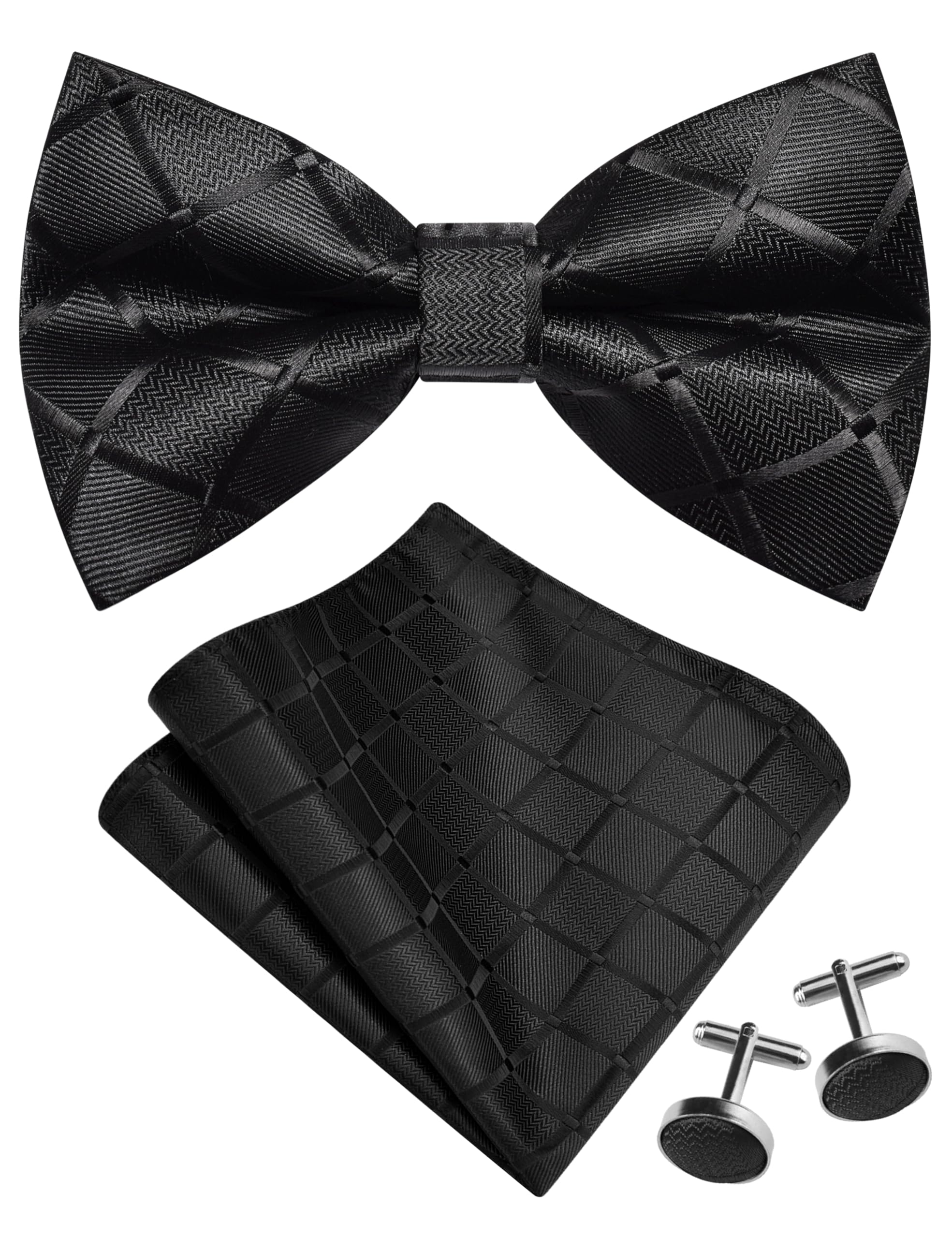 Black Bow Tie Pocket Square Set for Wedding Pre-Tied Silk Plaid Checkered Bowties Handkerchief Cufflinks for Men (0494-24)