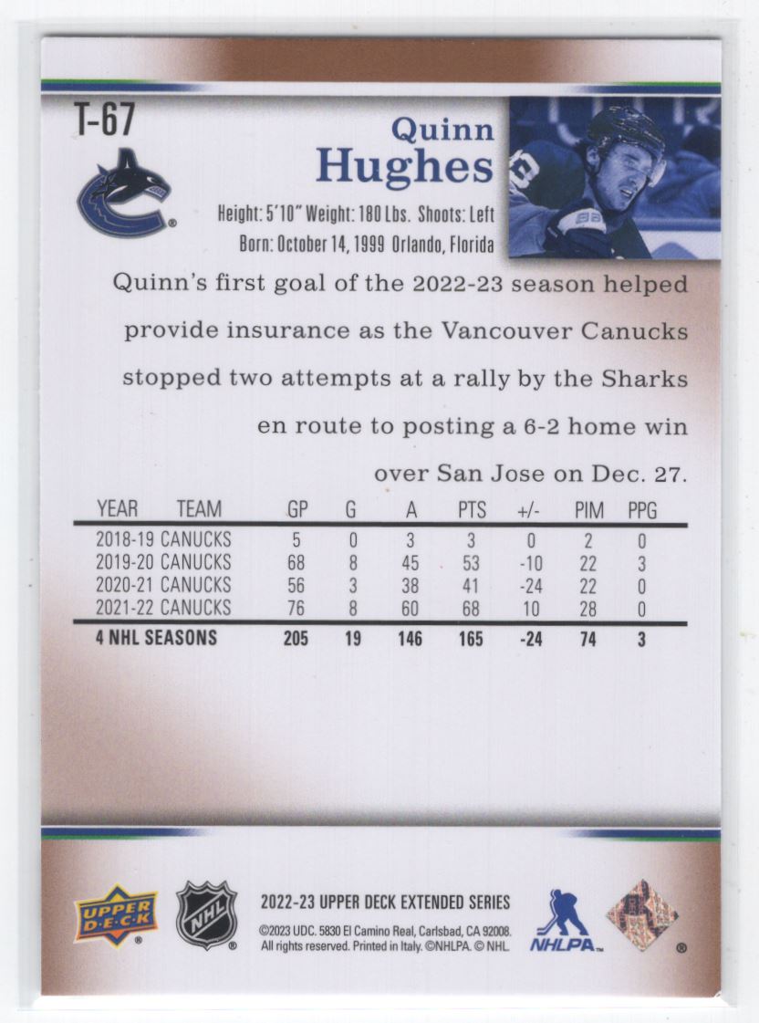 #T-67 2022-23 Upper Deck 2007-08 Retro ^ Quinn Hughes Vancouver Canucks