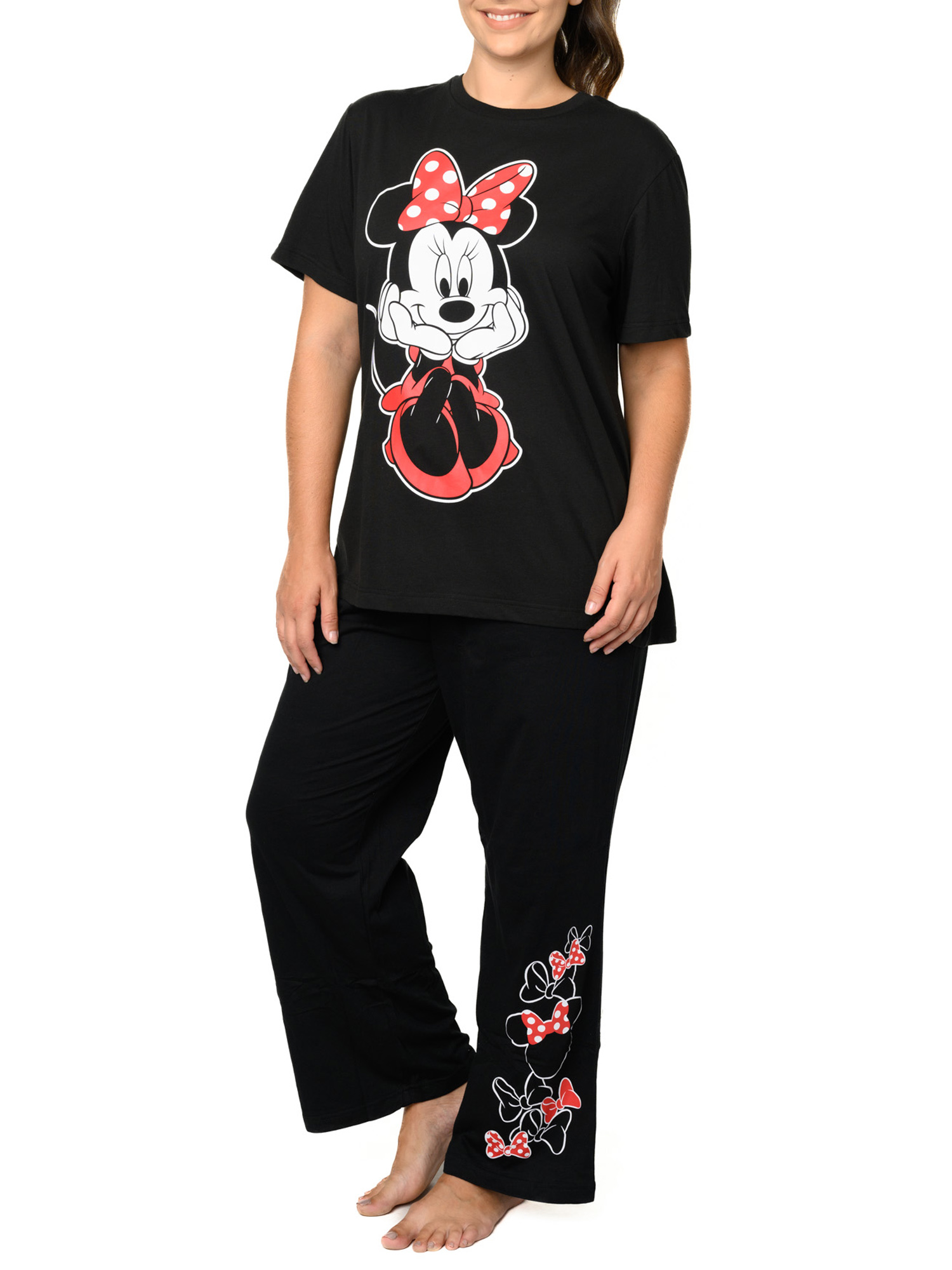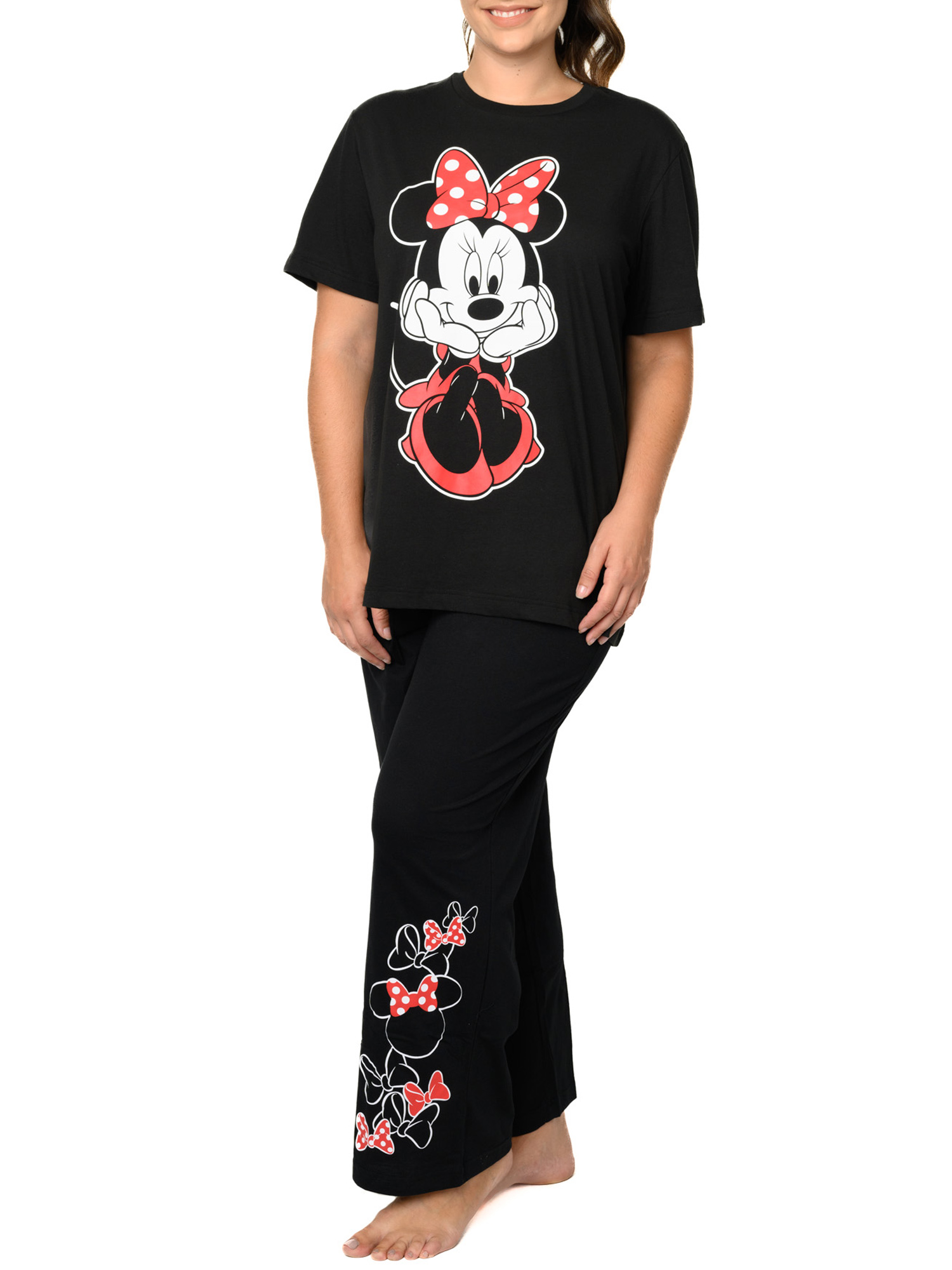 - Set Includes: (1) Disney Minnie Mouse Sitting T-Shirt Black & (1) Minnie Mouse Bows Icons Pajama Pants Lounge Wear Black