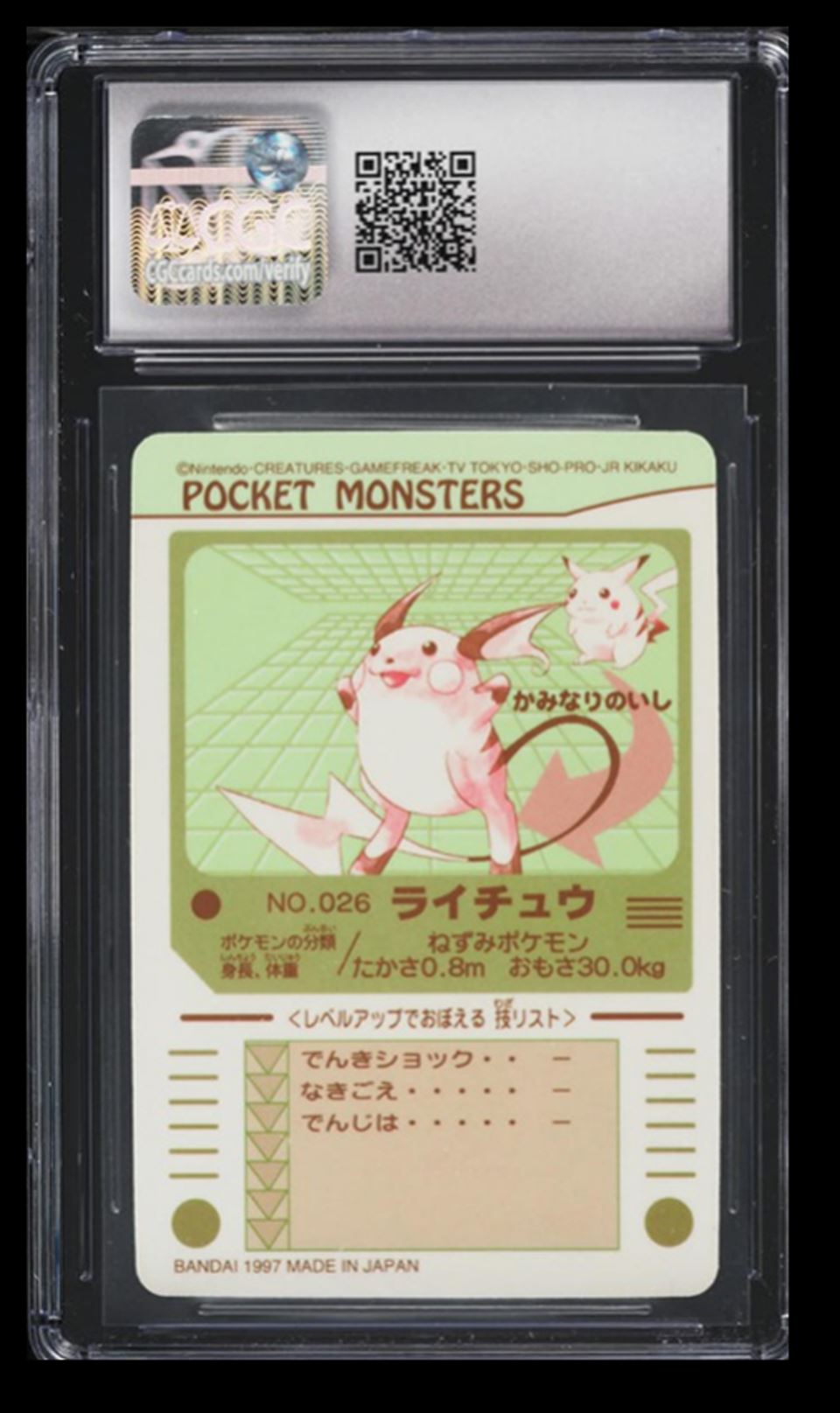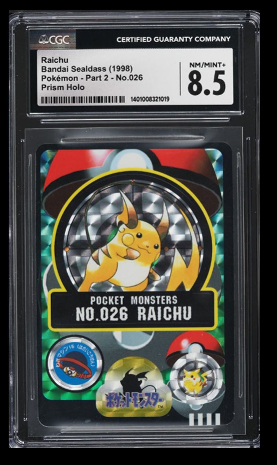 | 1998 Pokemon Bandai Sealdass Part 2 Raichu CGC 8.5 Japanese #026 Prism Holo |