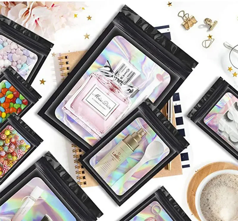 These holographic resealable bags are perfect for packaging and storing small items while giving them a stylish and eye-catching look. Featuring a shiny iridescent front and a solid back, they are ideal for displaying products clearly.