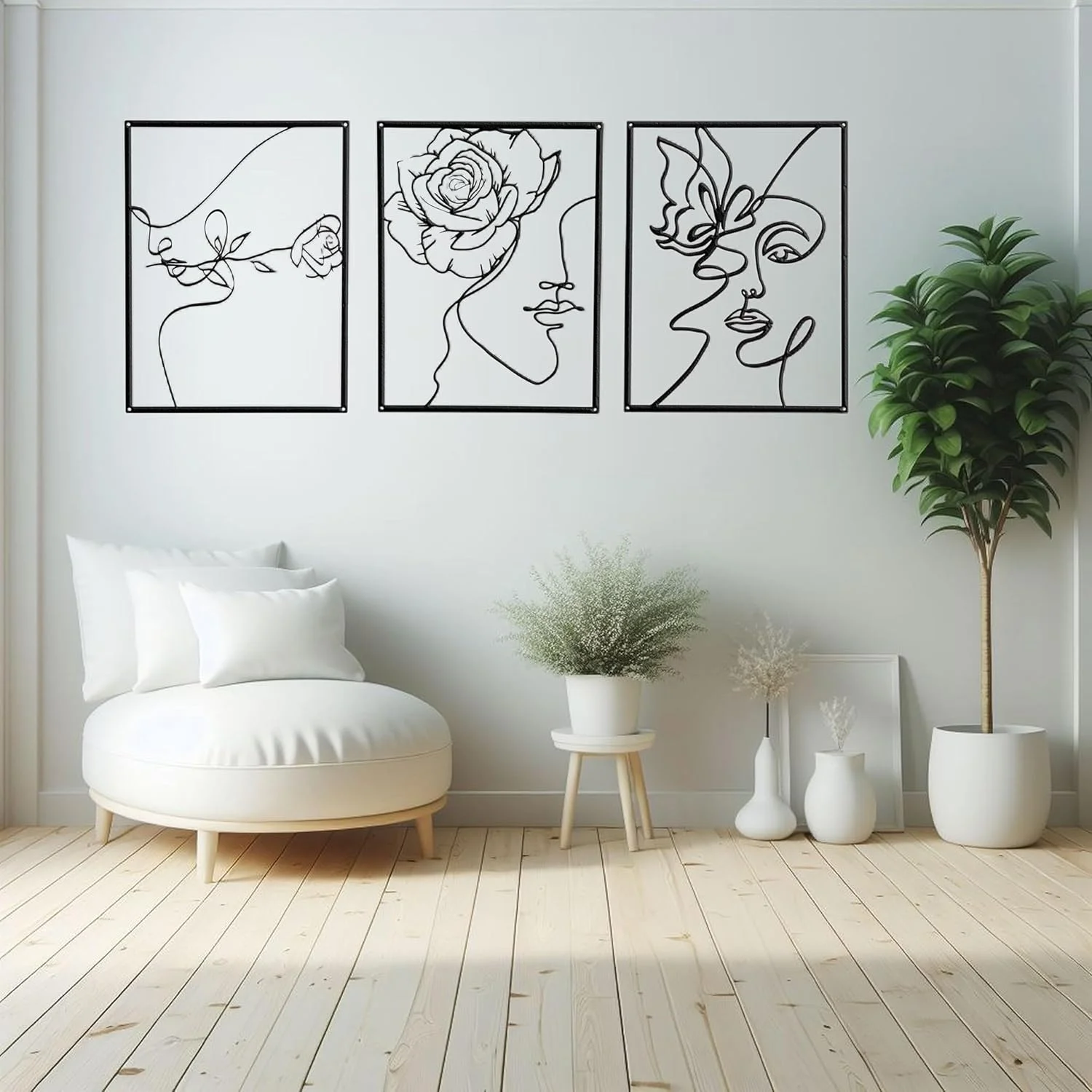 • Abstract Line Art Design: This set includes three unique pieces, each featuring a abstract female face intertwined with floral elements. The clean lines and artistic design create a modern and elegant aesthetic, perfect for any contemporary space.