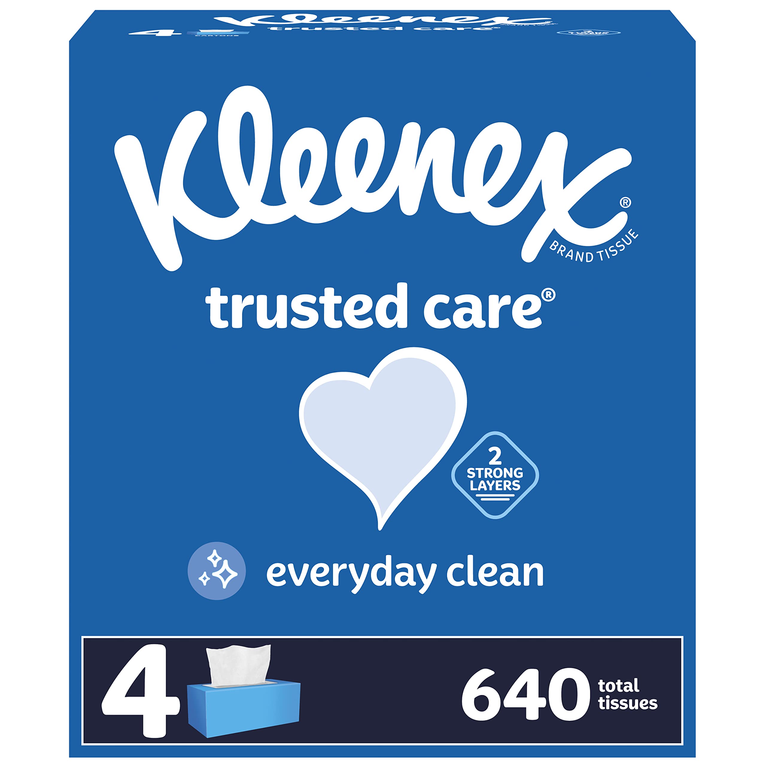 America’s favorite tissue, Kleenex Trusted Care is perfect for everyday sniffles, sneezes and even little drips or spills! Whether you’re looking for a box for your home or office, with Kleenex Trusted Care Facial Tissues, you get 4 flat boxes of 160 tissues, so you have plenty of single tissues for any occasion. Designed for runny noses and watery eyes, our dye-free, soft and strong tissue is thick and absorbent to keep hands clean. Plus, you can find tissue boxes that fit your home because each tissue box is available in various colors and designs. Got the sniffles? Soothe that runny nose with a box of Kleenex Soothing Lotion or Kleenex Ultra Soft facial tissues.