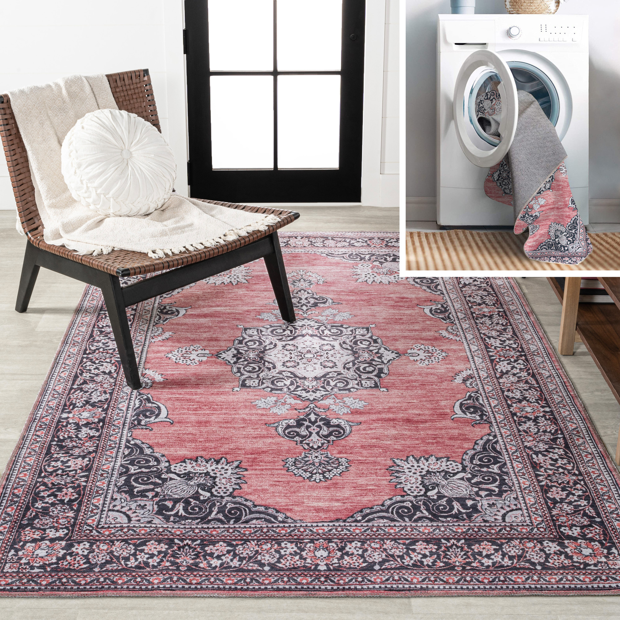 - Machine washable rug made of chenille - just use mild, non-bleach detergent; hang to dry