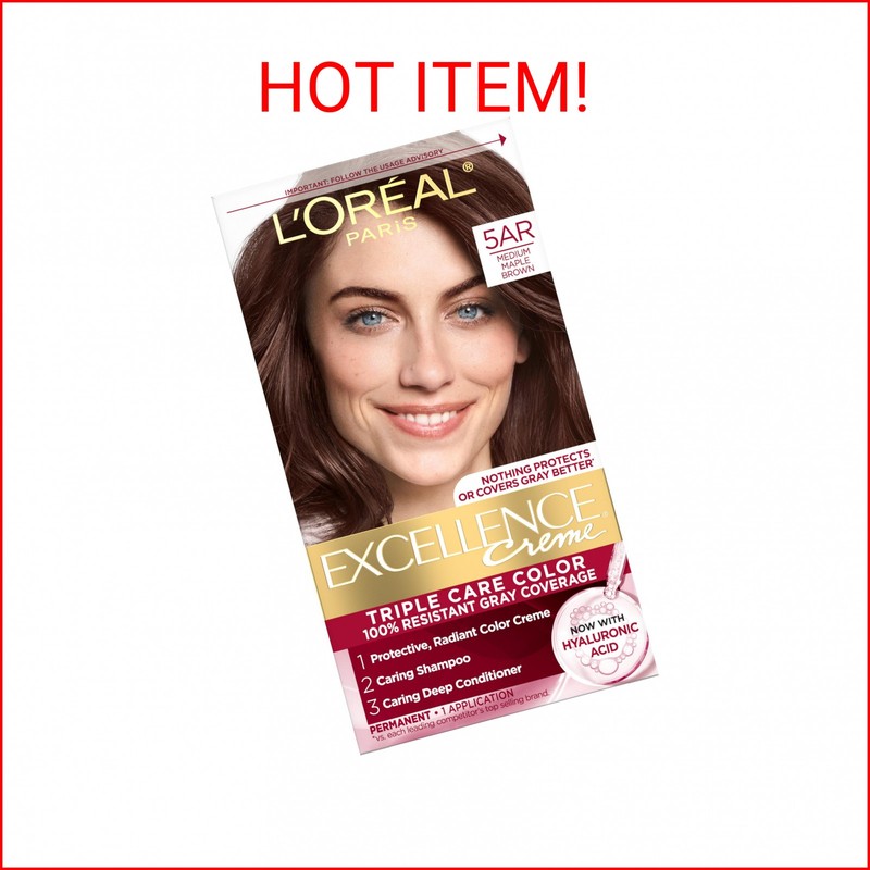 L'Oreal Paris Excellence Crème Permanent Hair Dye, Triple Care Hair Color with Hyaluronic Acid for 100% Gray Coverage, 5AR Medium Maple Brown, 1 Kit (Packaging May Vary)