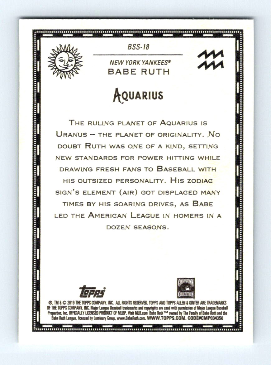 #BSS-18 2019 Topps Allen & Ginter Baseball Star Signs Babe Ruth Yankees