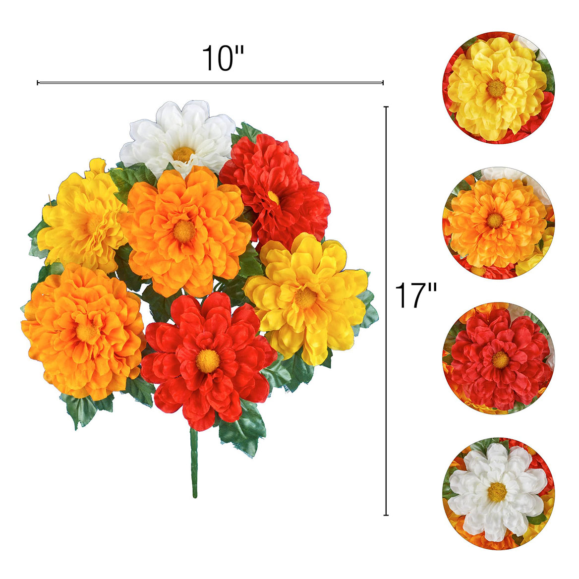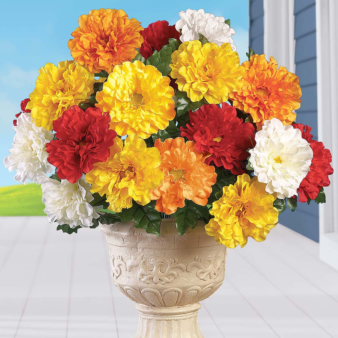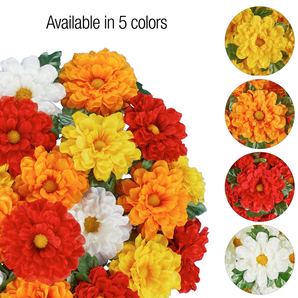 These beautiful flowers are the perfect way to add instant color indoors or outside. The set includes 3 full bunches of zinnias in your choice of red, white, gold, orange or multicolor. They're perfect to display in your pots or baskets (not incl.), or stake them into the ground in your garden. Use separately for smaller bouquets or all together for a bold and beautiful arrangement (as shown). Plastic and polyester. Each bunch is approx. 10"Dia. x 17"H. Set of 3. Specify ONE color per set: Red, Gold, White, Orange or Multi.