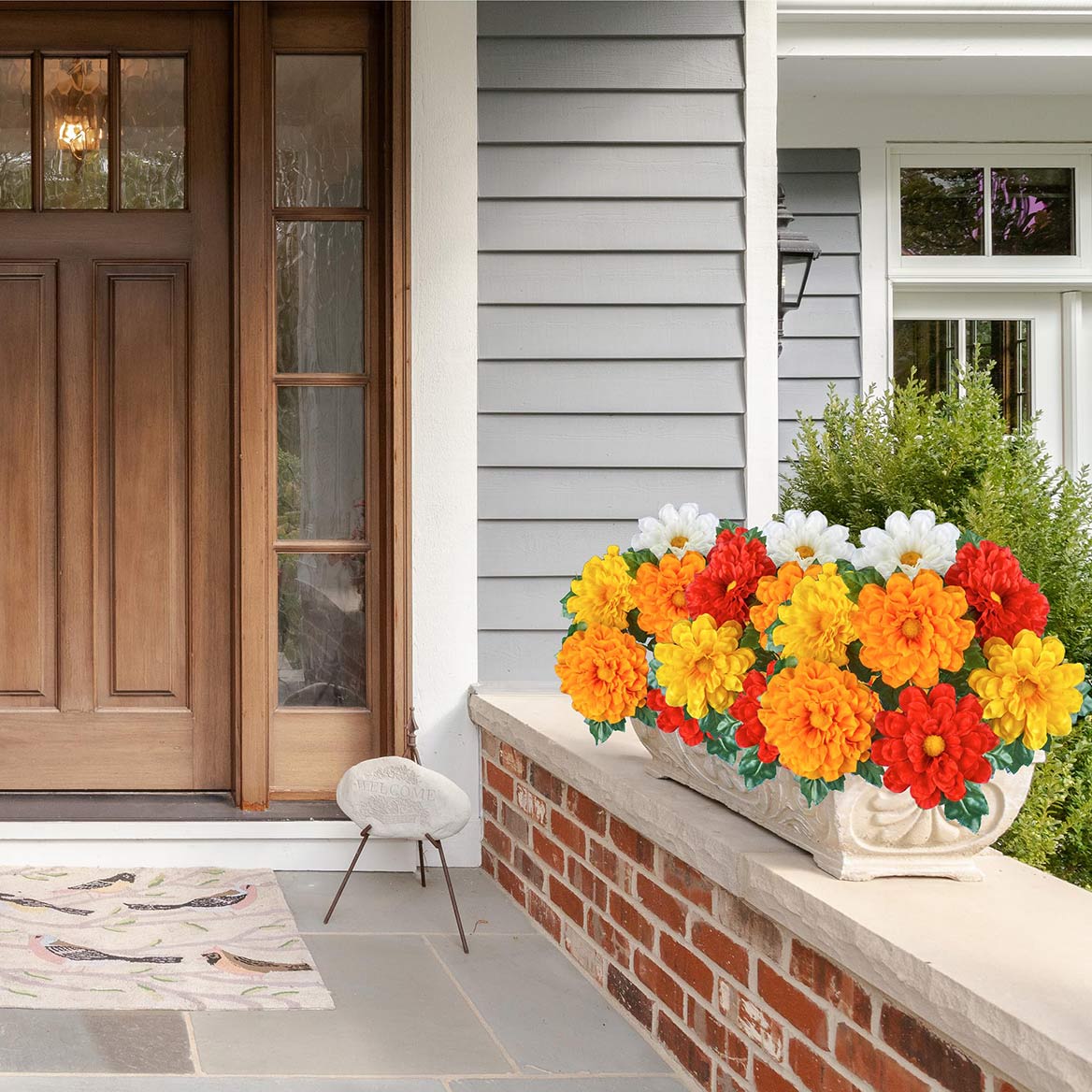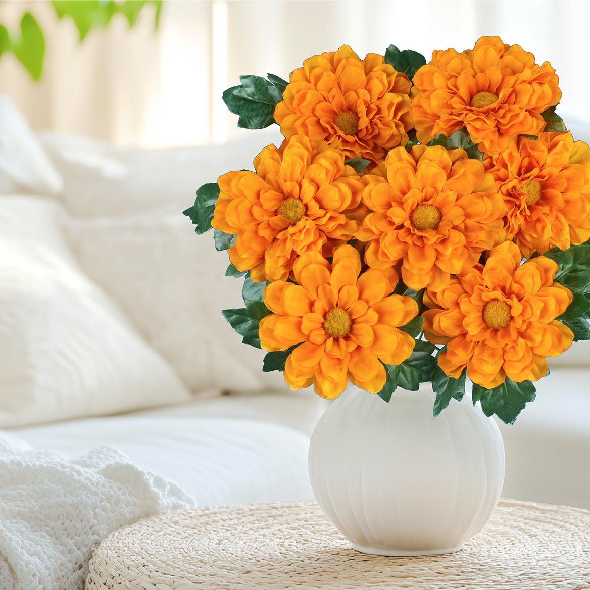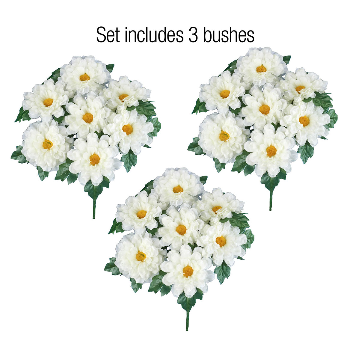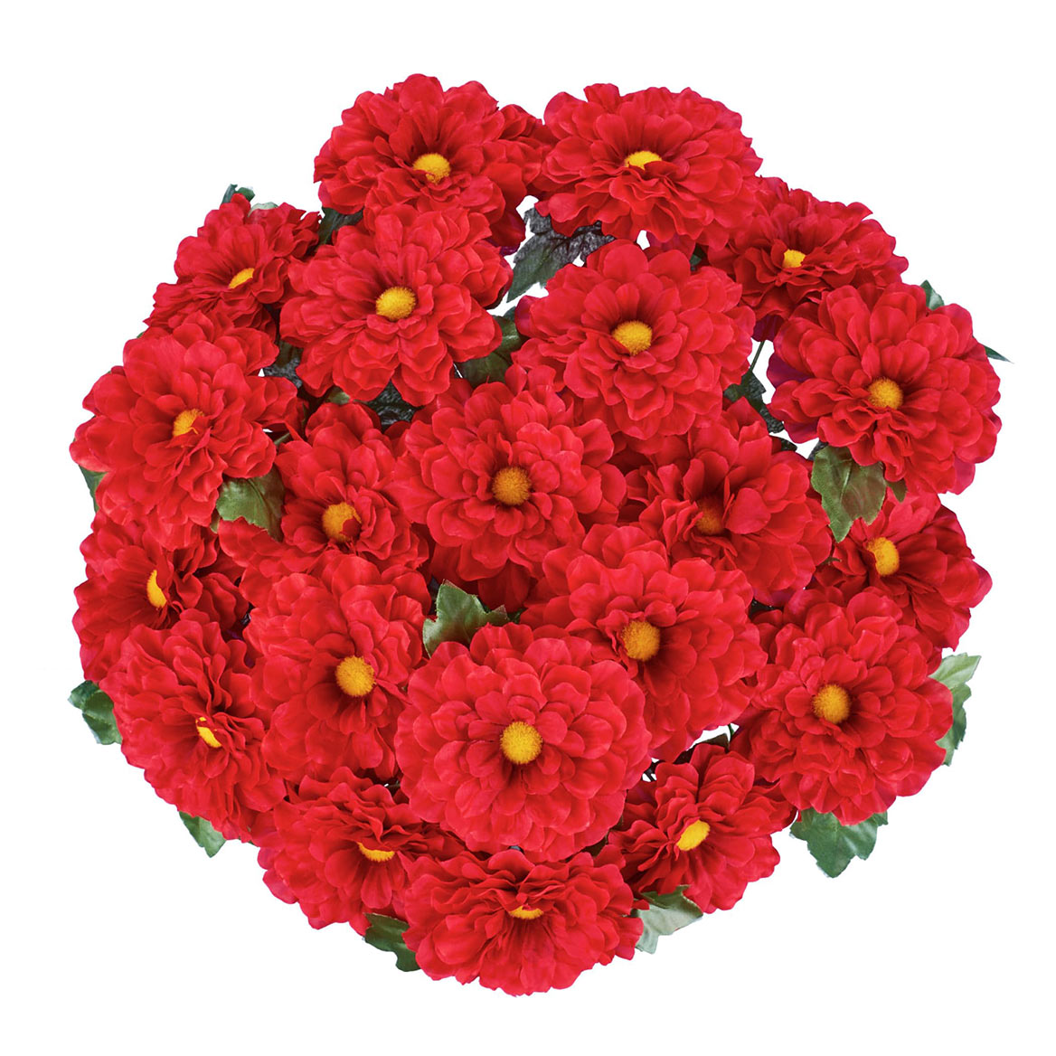 These beautiful flowers are the perfect way to add instant color indoors or outside. The set includes 3 full bunches of zinnias in your choice of red, white, gold, orange or multicolor. They're perfect to display in your pots or baskets (not incl.), or stake them into the ground in your garden. Use separately for smaller bouquets or all together for a bold and beautiful arrangement (as shown). Plastic and polyester. Each bunch is approx. 10"Dia. x 17"H. Set of 3. Specify ONE color per set: Red, Gold, White, Orange or Multi.