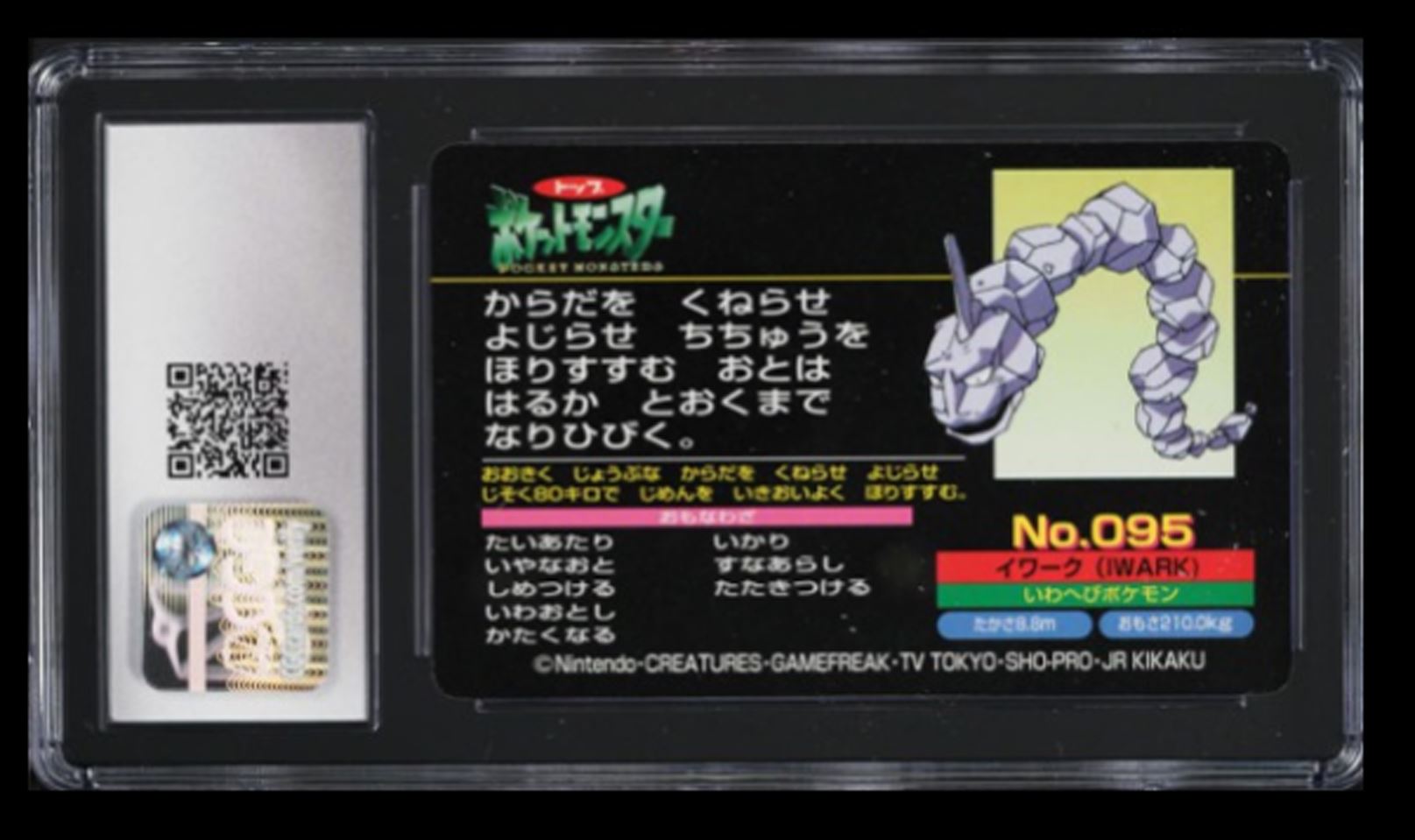 | Description: | Onix vs. Pikachu | | Category: | Pokemon | | Year: | 2000 | | Product: | Pokemon | | Set: | Top-Seika Gold & Silver | | Team: | Japanese | | Card Number: | 095 | | Grade: | 8.5 CGC | | Dimensions: | 5¼" x 3⅛" | | SKU: | PM GRD0024 R01 B (9) |