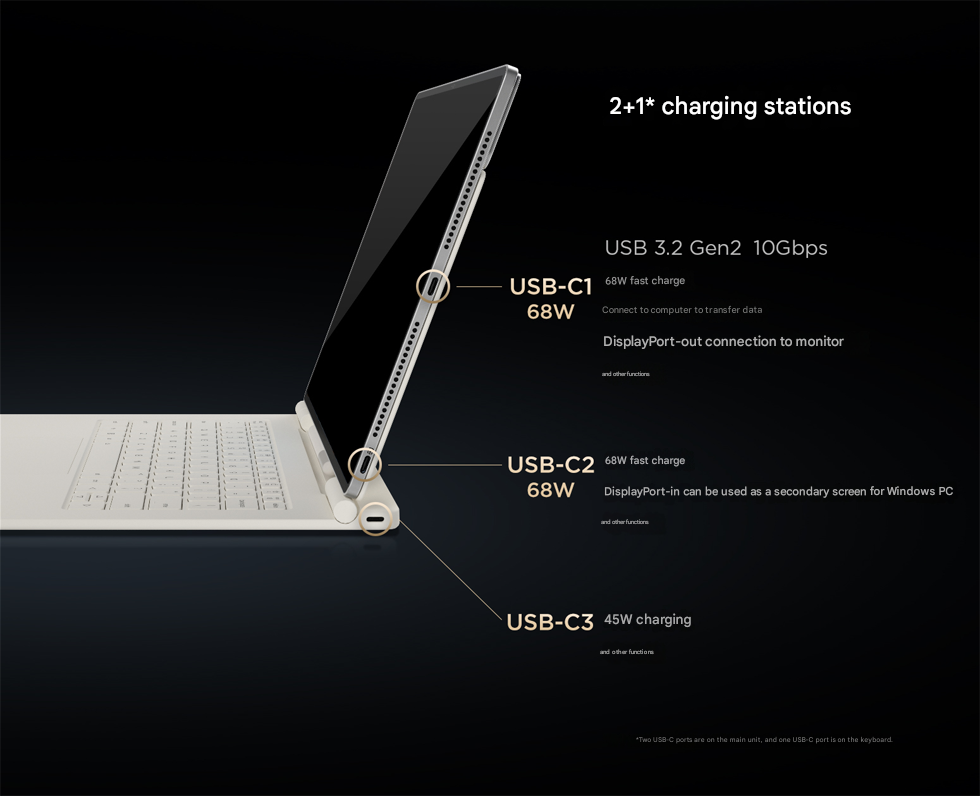 | Buttons, Ports & Slots | Volume up / down 4-point Pogo pin keyboard connector Power button USB 3.2 Type-C |
